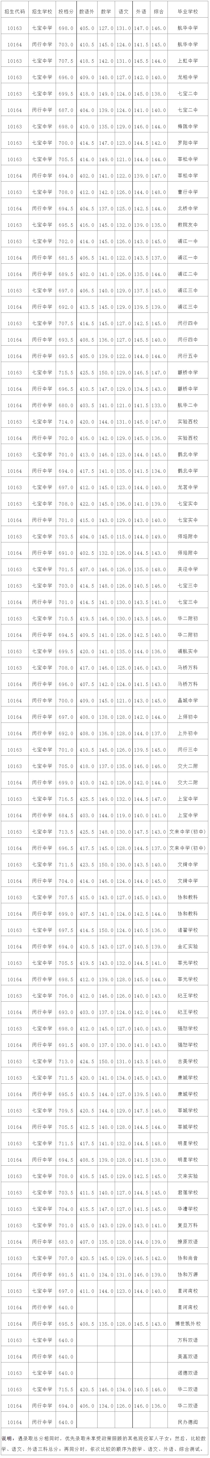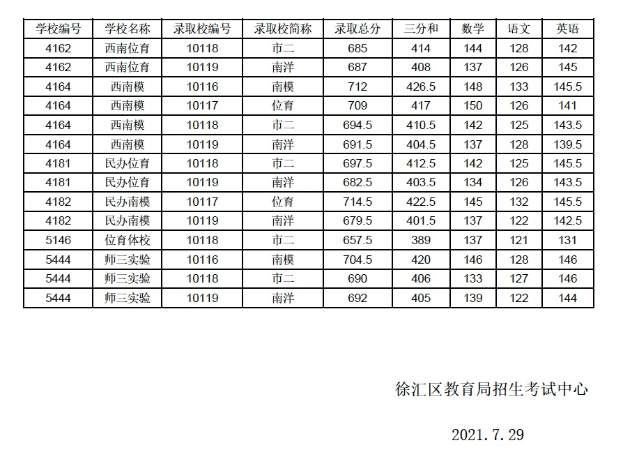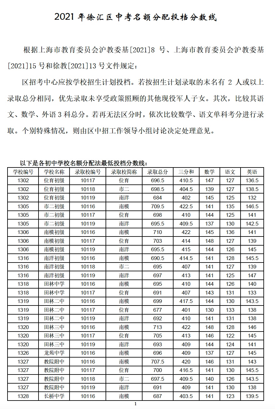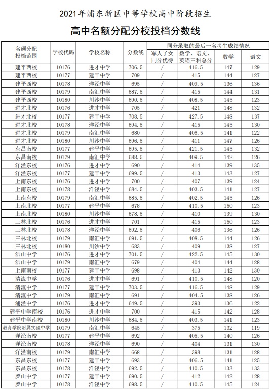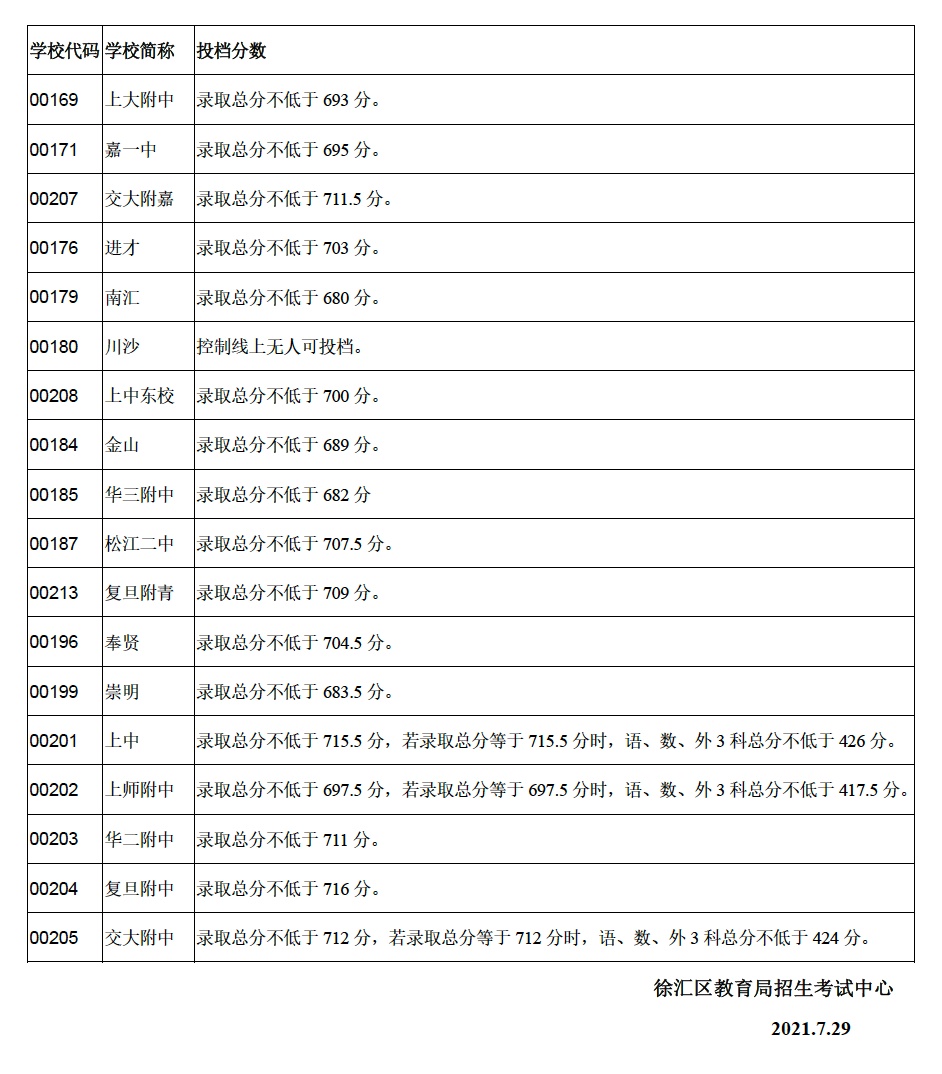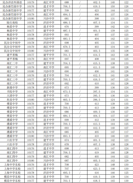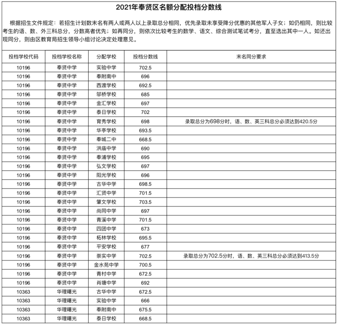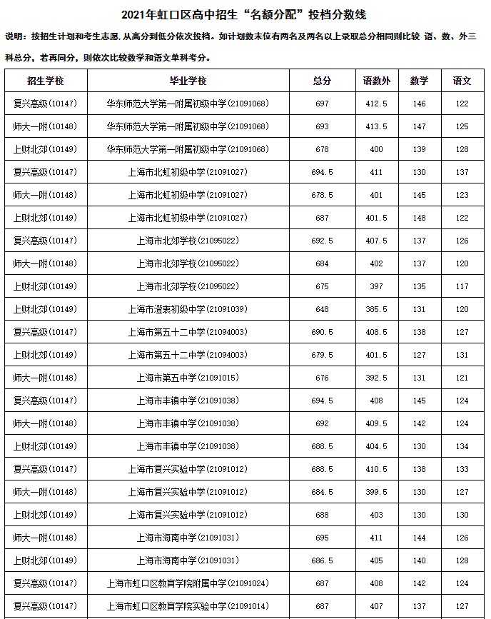 2021年上海市中等学校高中阶段招生(闵行区)名额分配投档分数线