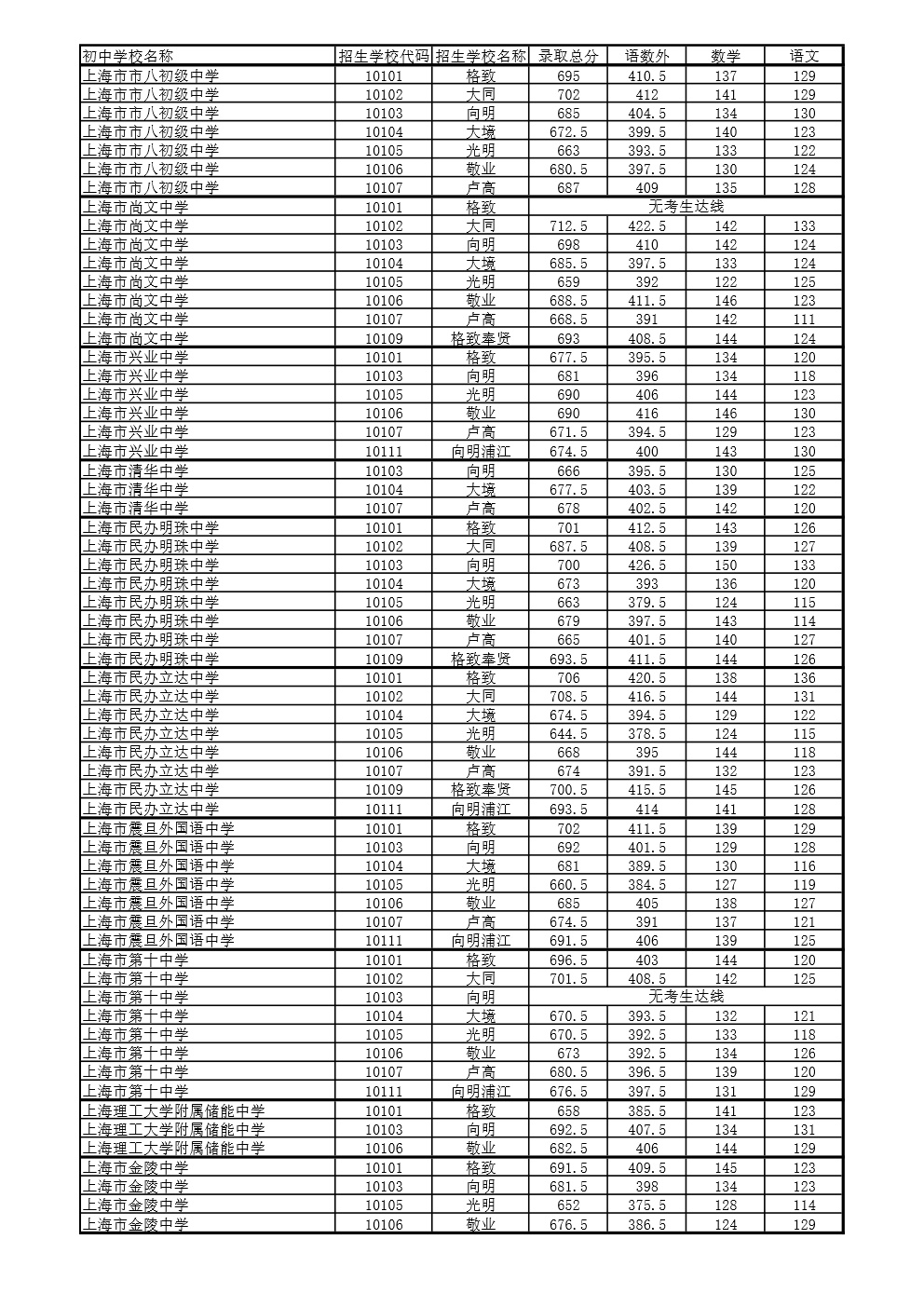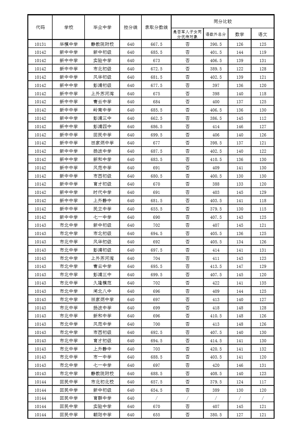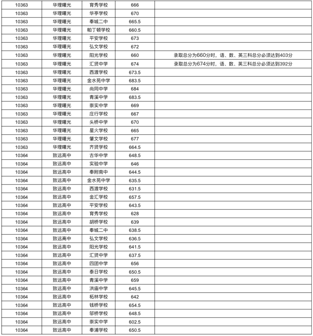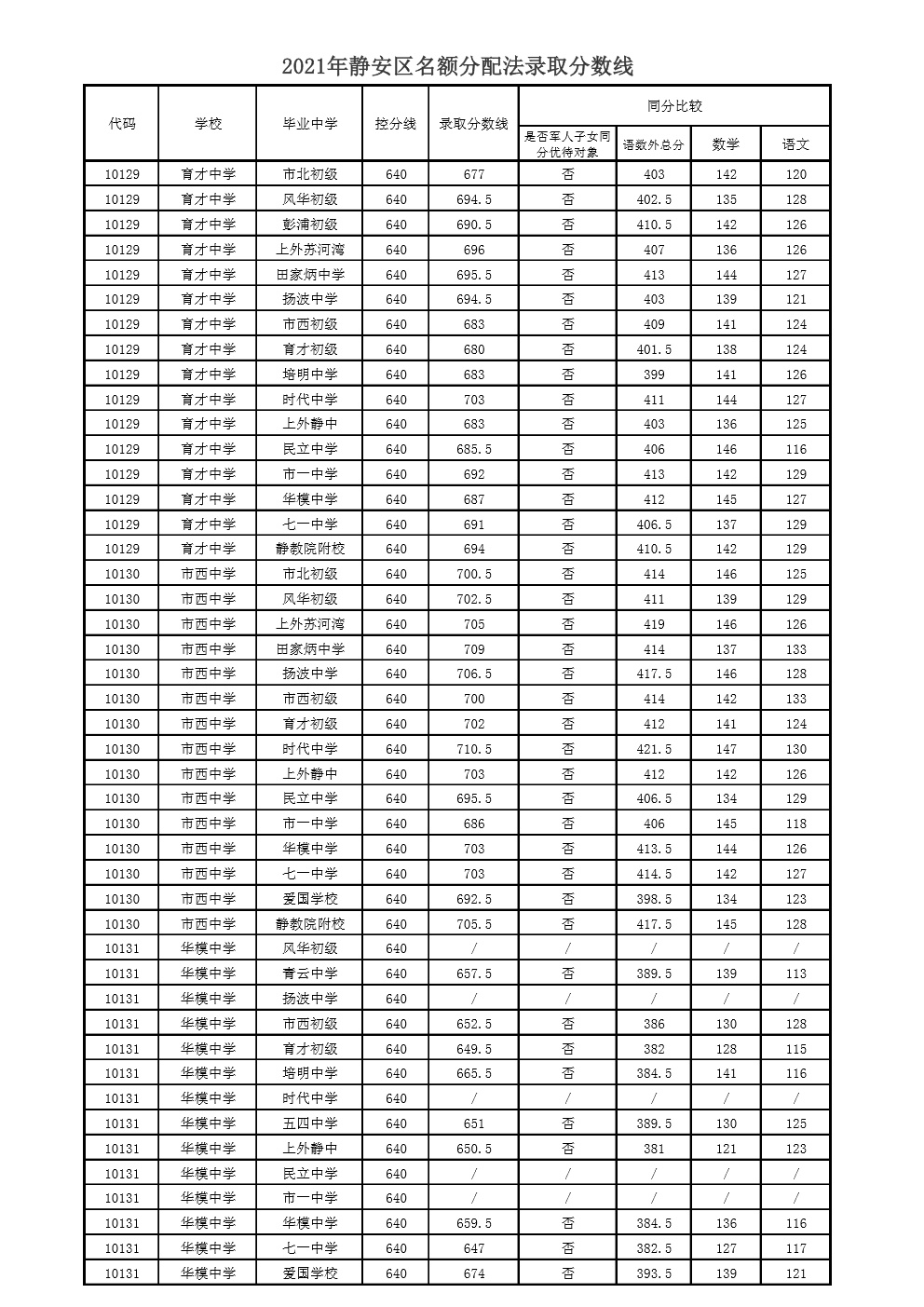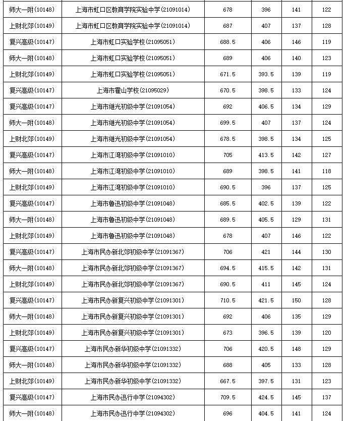 2021年上海市中等学校高中阶段招生(闵行区)名额分配投档分数线