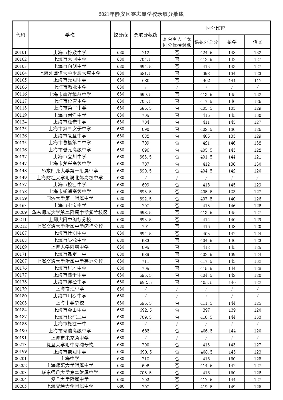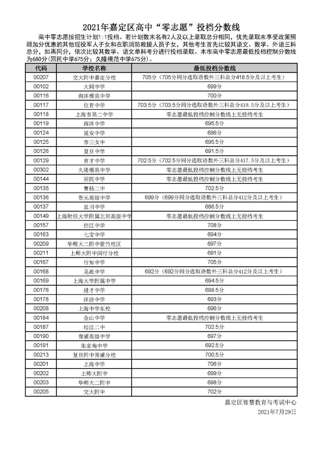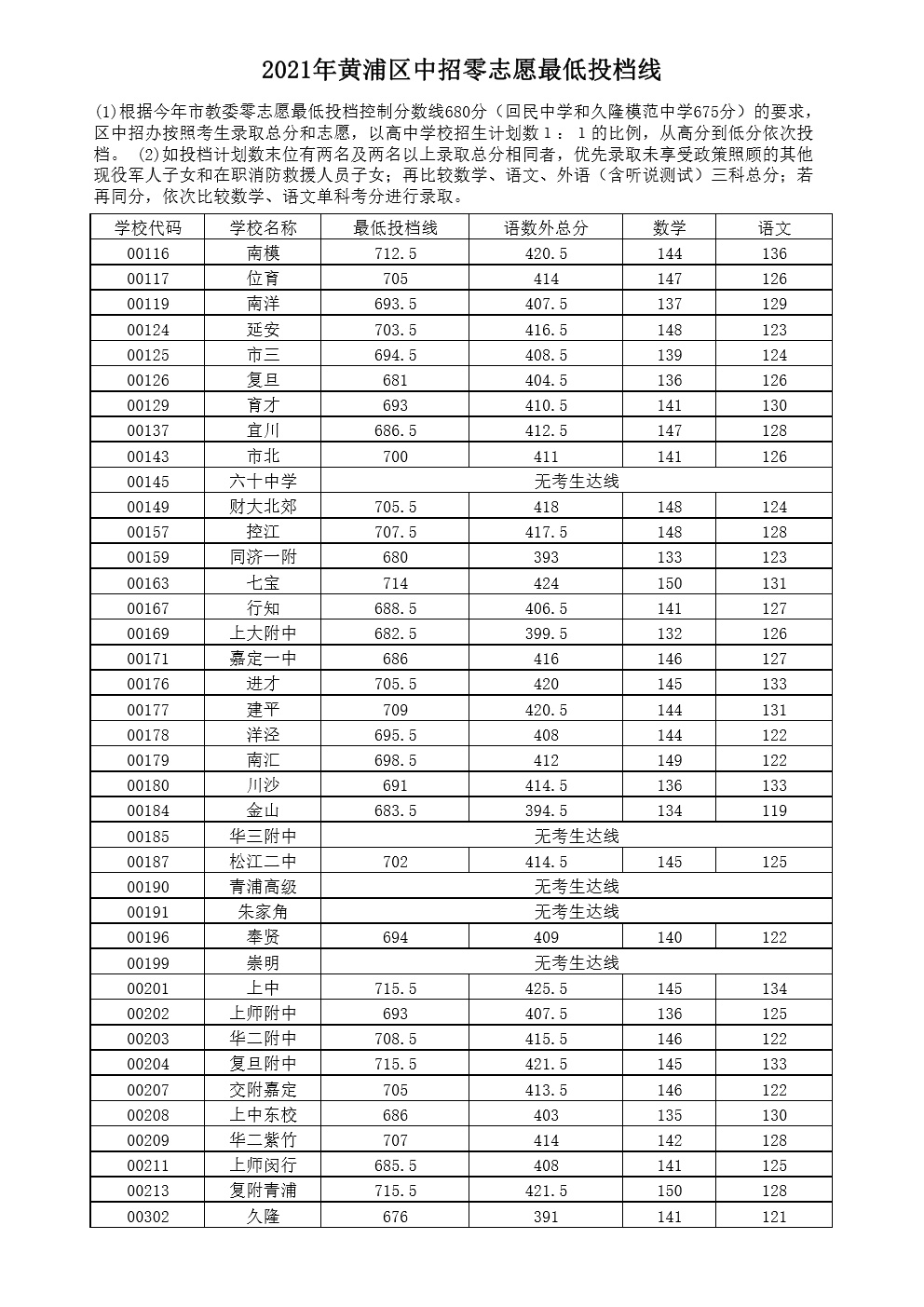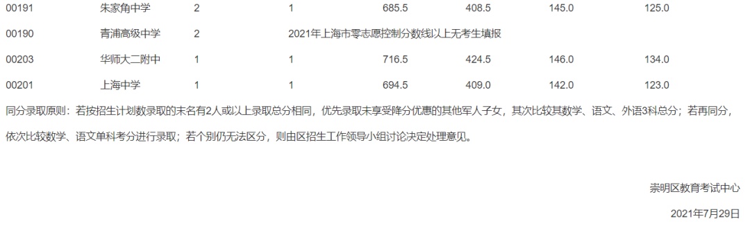 2021年上海市中等学校高中阶段招生(崇明区)零志愿投档分数线