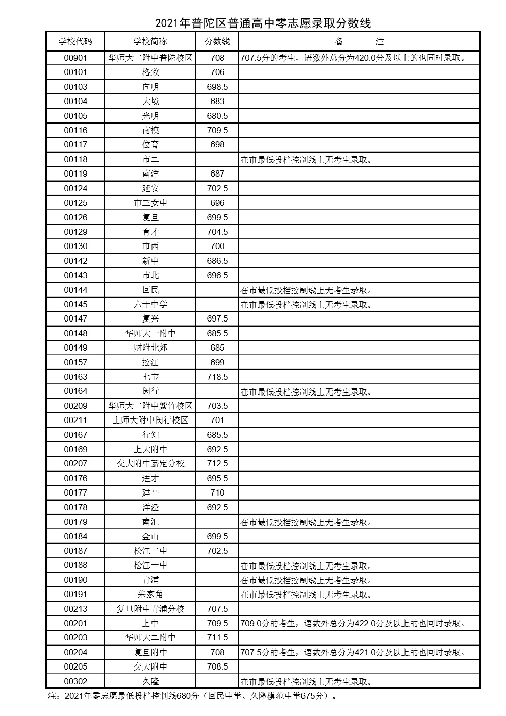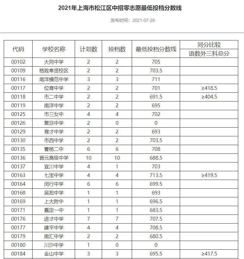 (2021年宝山区“零志愿”投档分数线)