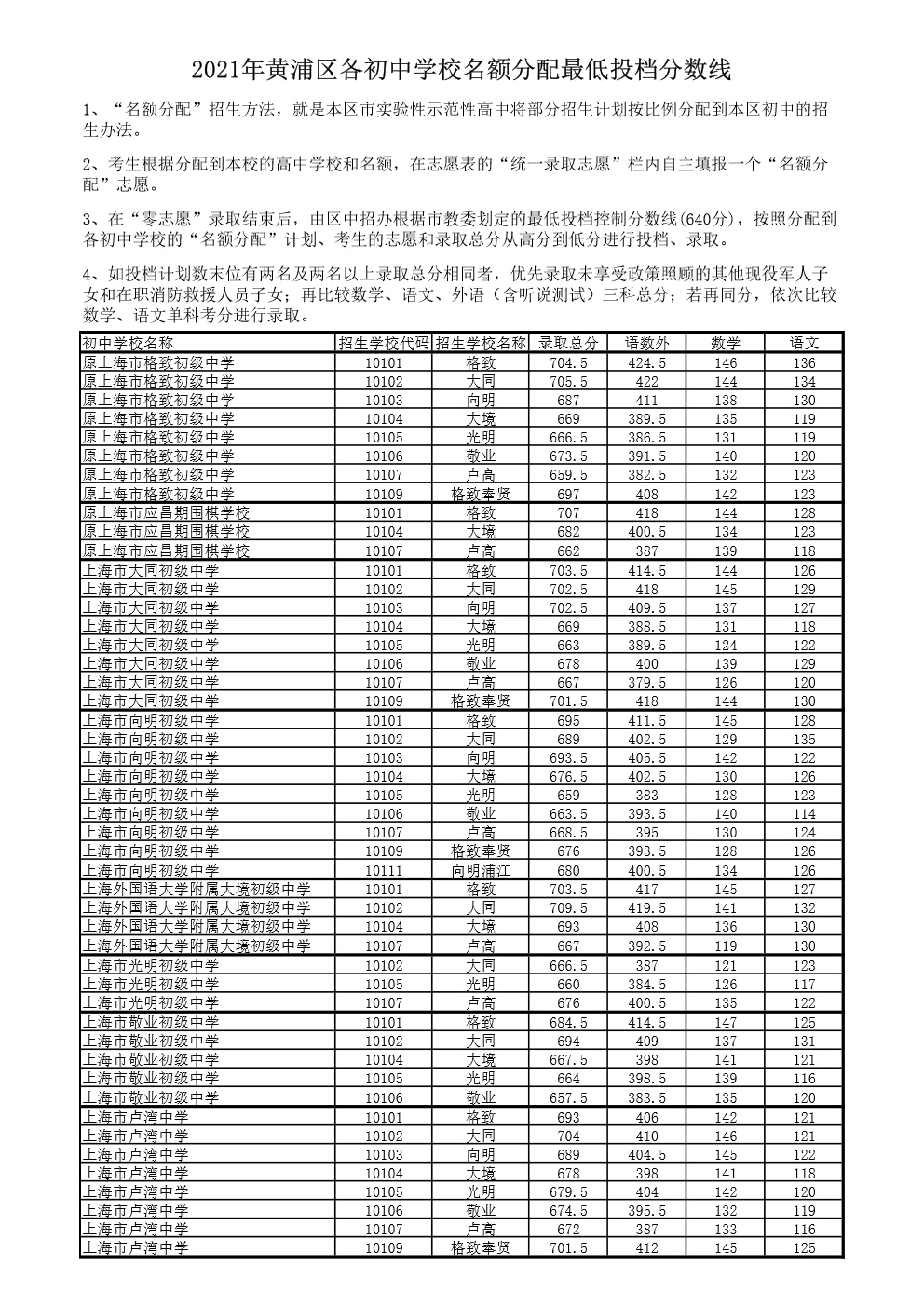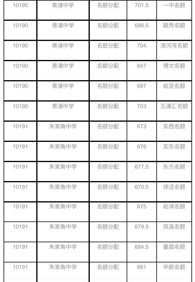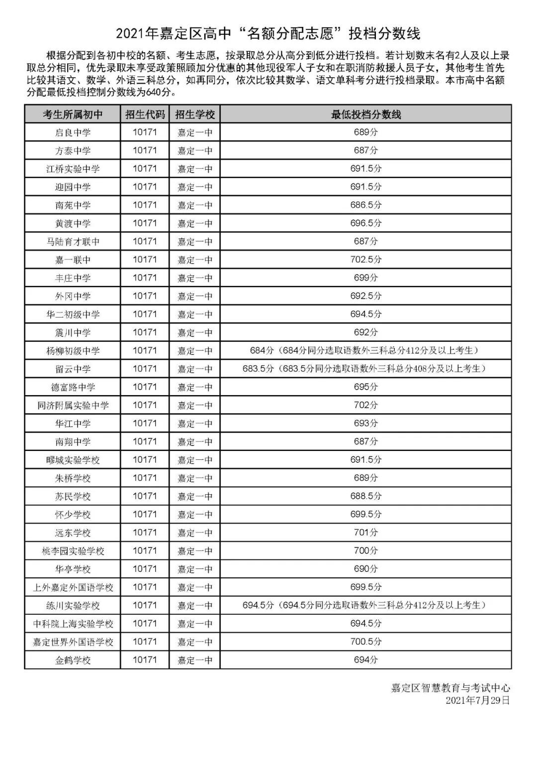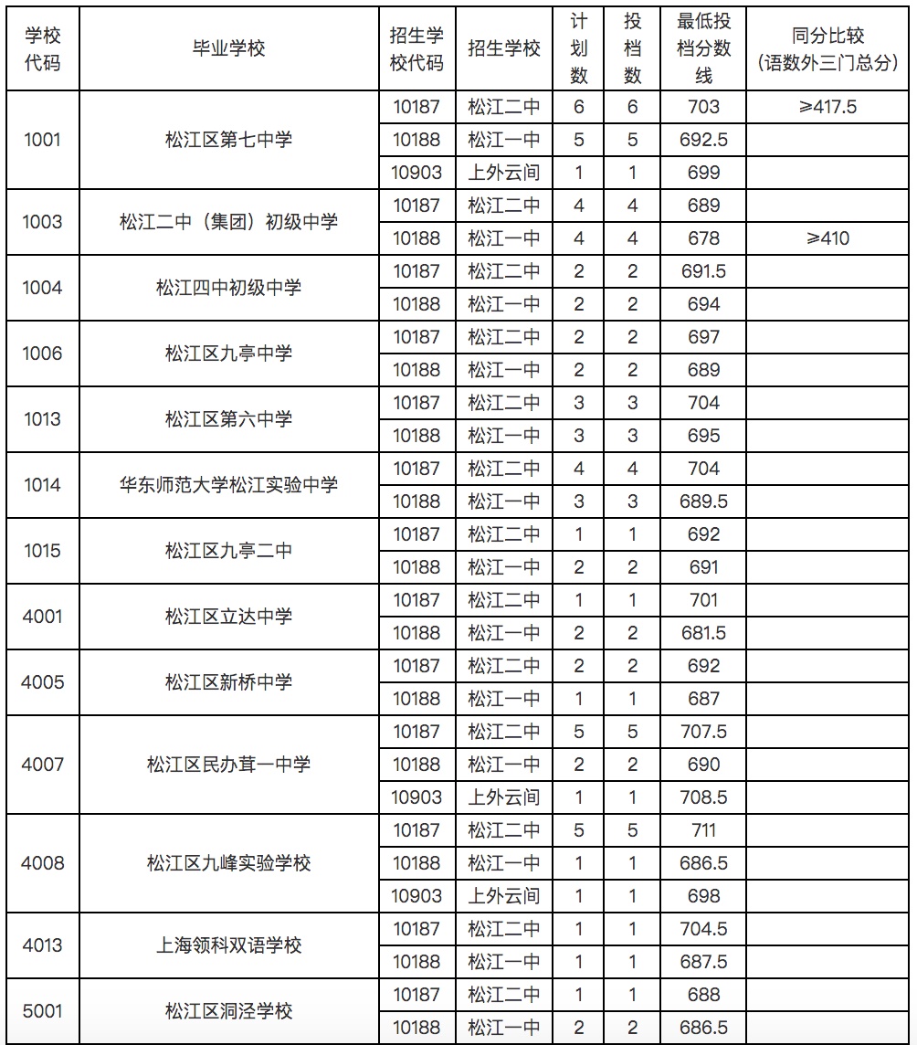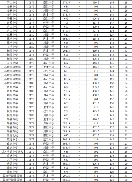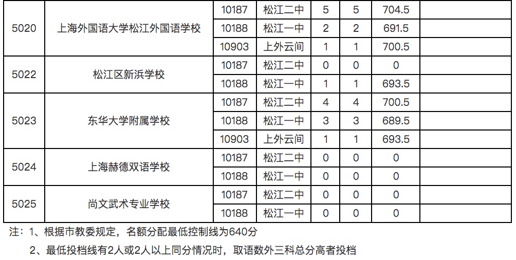 2021年松江区中招"名额分配"最低投档分数线