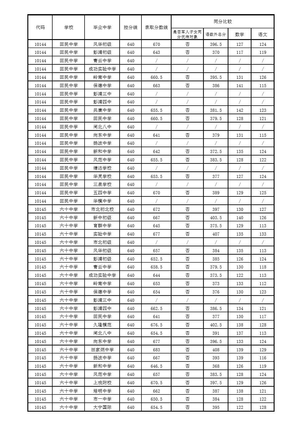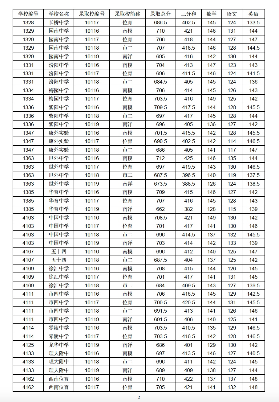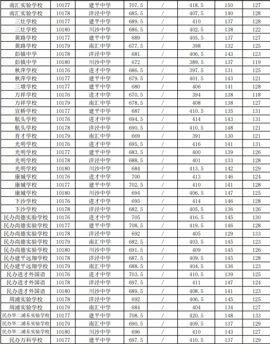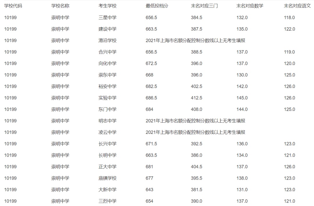 2021年上海市中等学校高中阶段招生(崇明区)名额分配投档分数线