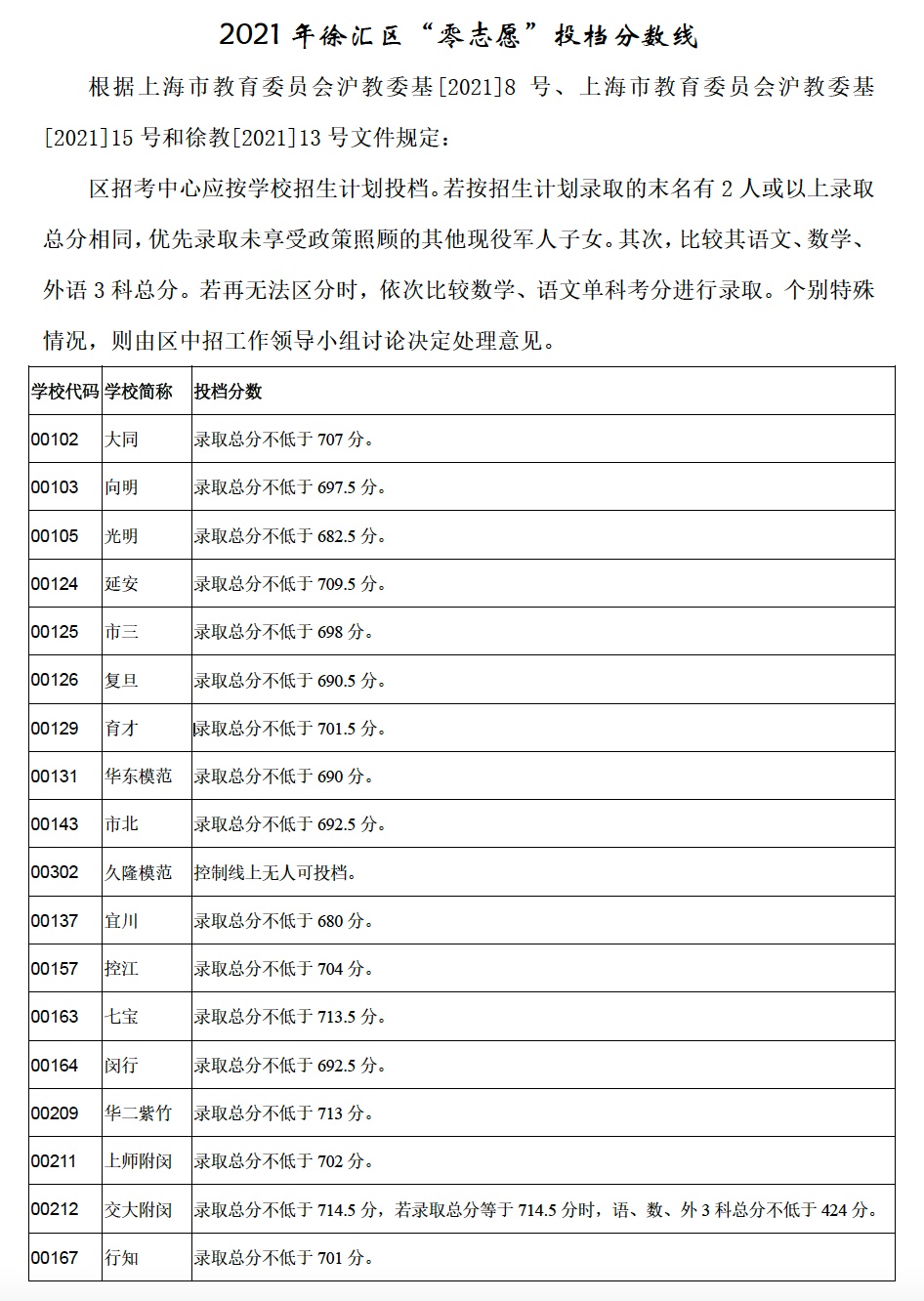 2021年上海市中等学校高中阶段招生(闵行区)零志愿投档分数线
