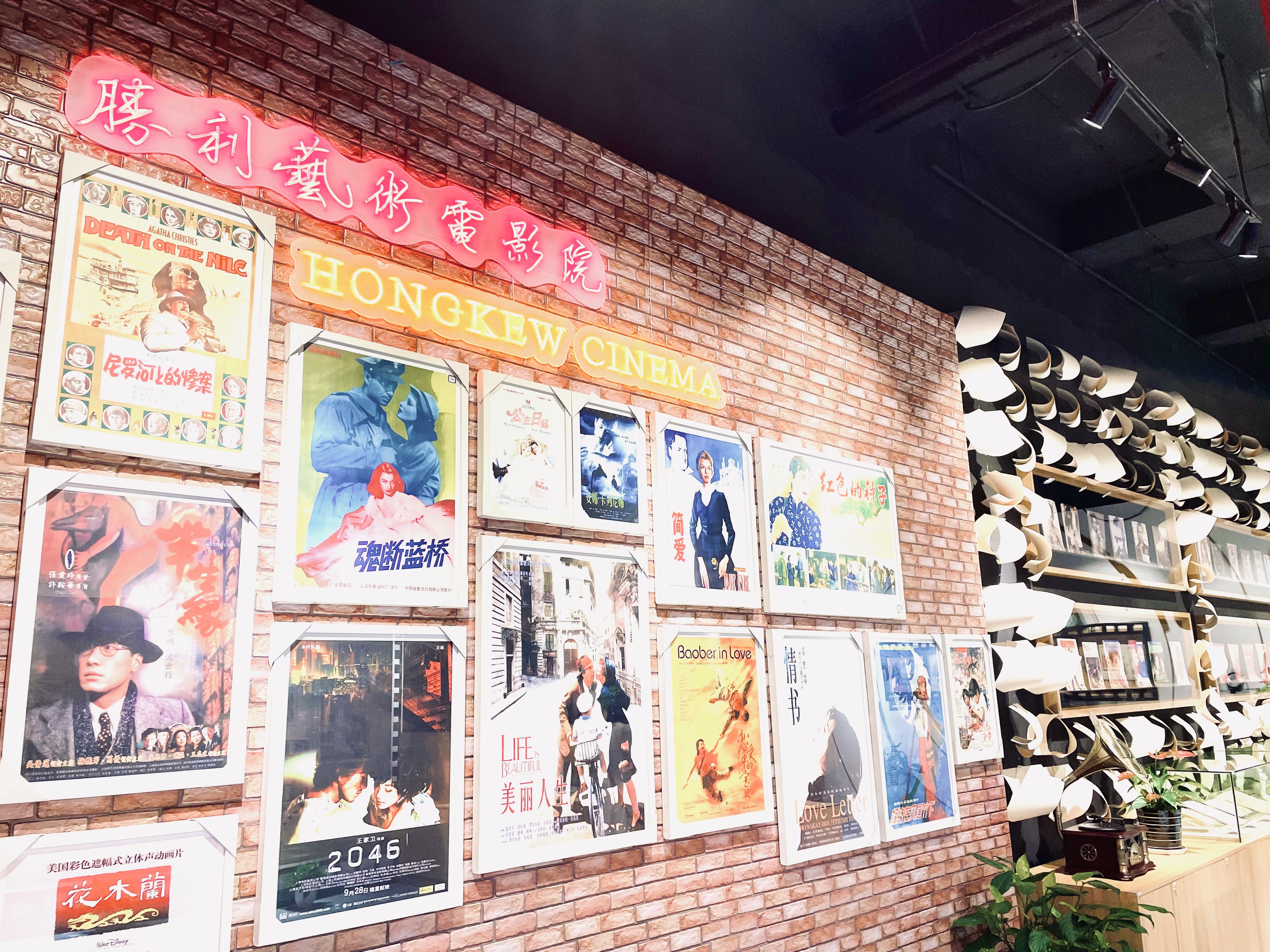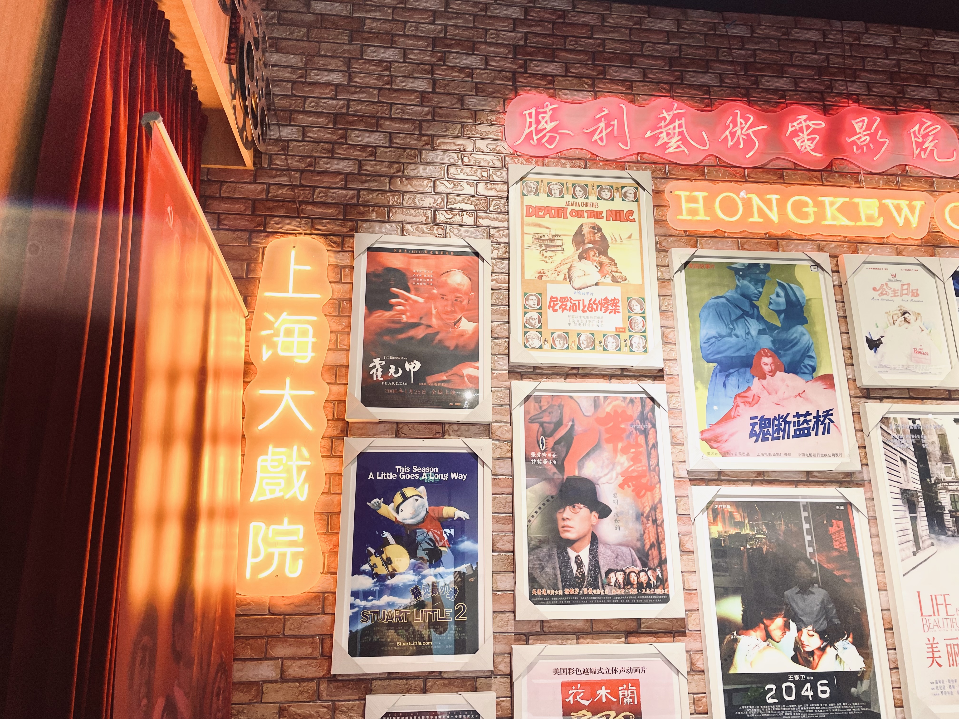 走入展厅深处,一面高高的海报墙吸引了小虹的注意。这面墙上贴着的无数经典电影海报,皆来自上海影视图书馆多年来的藏品,为纪念过去在虹口这片土地上诞生的影院,海报墙上用彩色荧光灯打出了这些影院的大名,让人一秒回到那令人难忘的岁月。