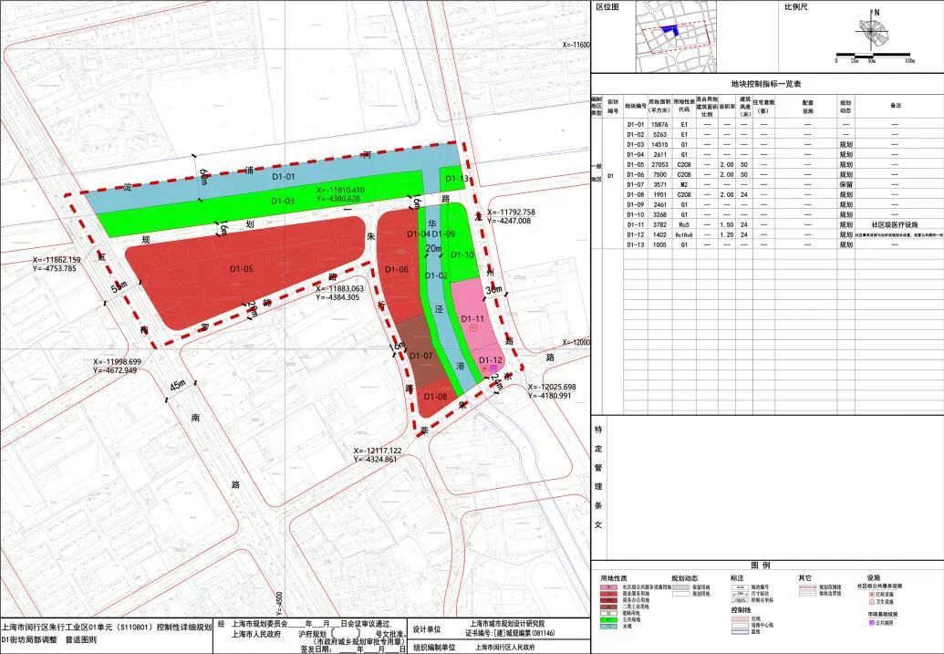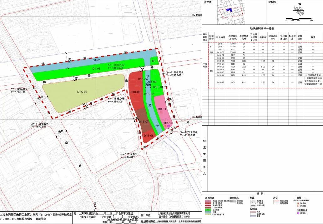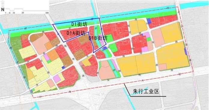 di、d1a、dib 街坊位于朱行工业区(s11-0801),四至范围为:东至龙州南路、南至罗锦东路-莘朱东路、西至虹梅南路-朱行路、北至淀浦河,总面积11. 40公顷。