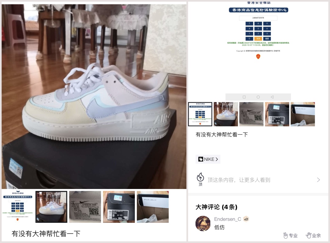 自己找代购在香港购买的大牌球鞋声称支持官网防 伪,但该机构在网上却怎么也查不到,而在得物 app 里的鉴别讨论区发帖求助后更是得到了“假鞋”的结论。抱着疑问正准备联系代购,却发现微信早已被拉黑。