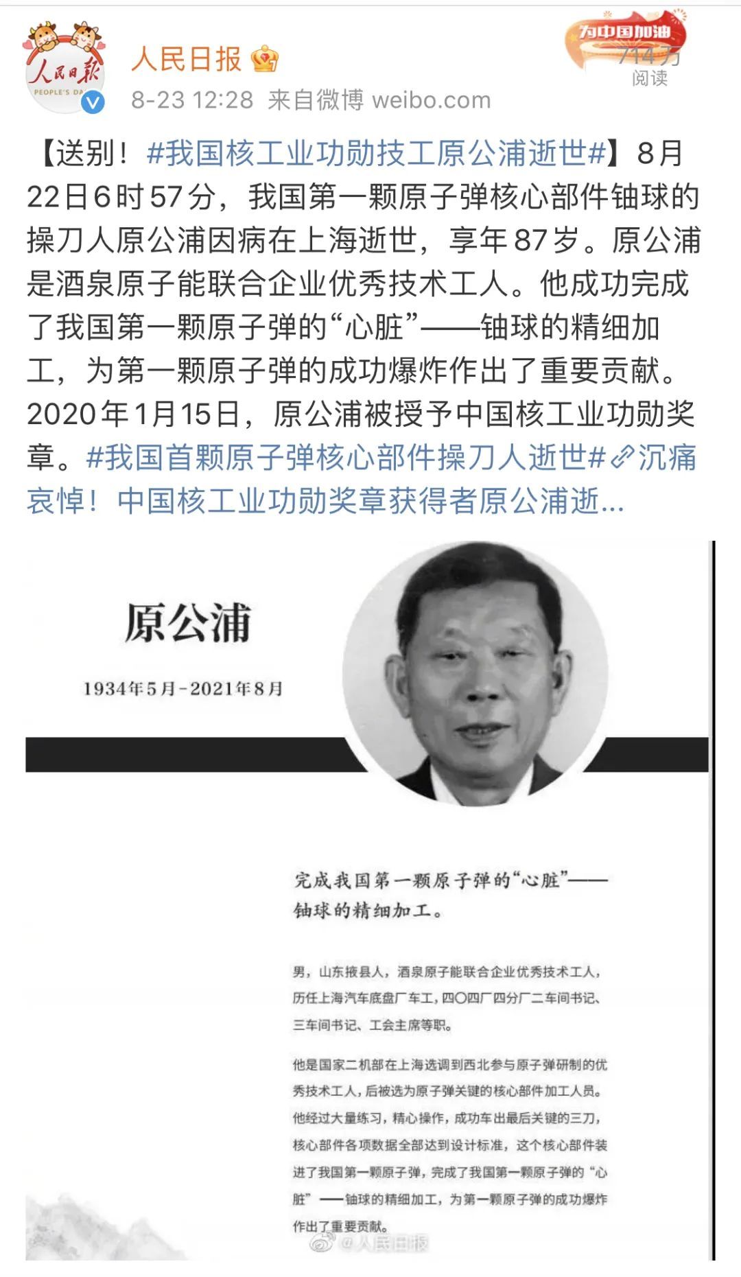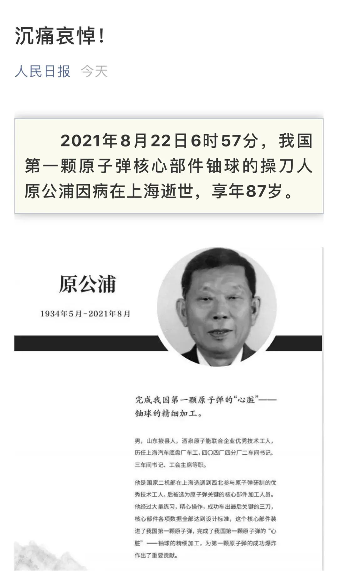 2021年8月22日6时57分,入选中国核工业功勋榜的技术工人代表、我国第一颗原子弹核心部件铀球的操刀人原公浦因病在上海逝世,享年87岁。