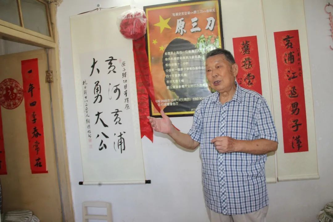 走进原公浦的家——一处老梅陇地区的老公房,不足7平方米的客厅墙上挂着两幅字和一张电视海报,“原三刀”三个字赫然醒目,两幅字里均藏着“公浦”两字。