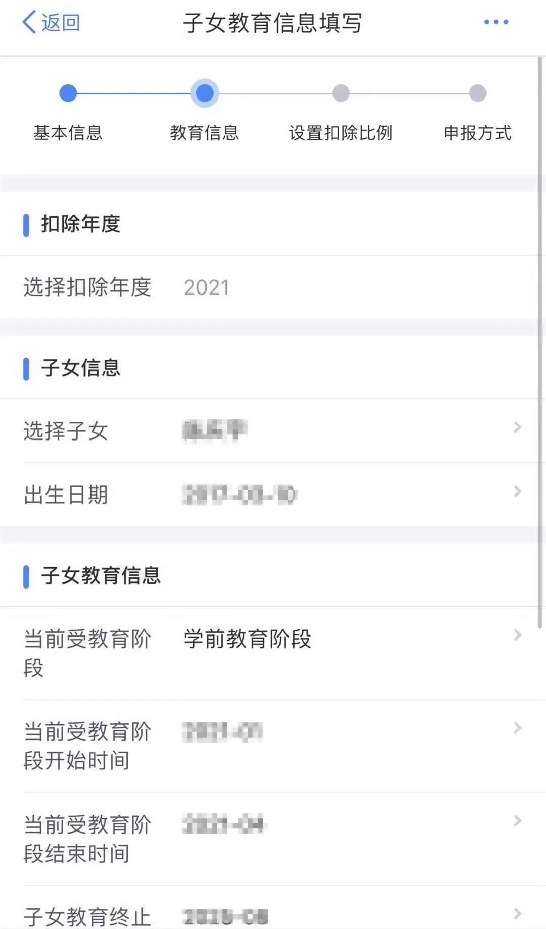 4. 根据实际情况选择和录入子女教育信息,如当前受教育阶段、当前受教育阶段开始时间和结束时间等,完善后点击【下一步】
