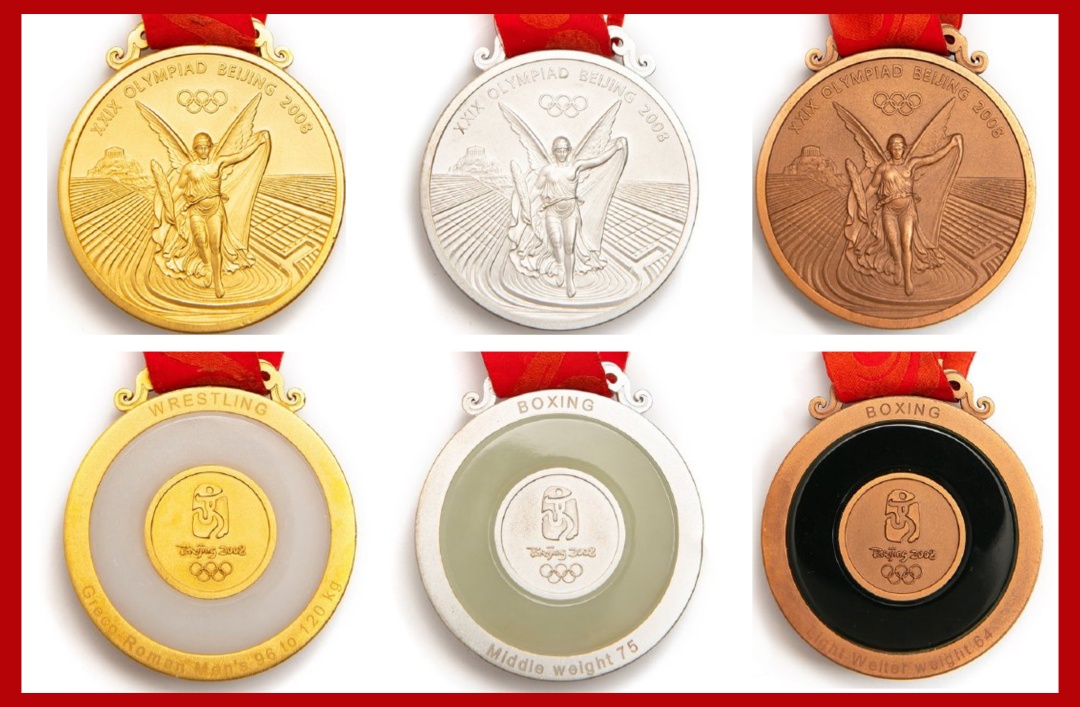2008年北京奥运会的奖牌突破了以往奥运会奖牌设计材质单一的传统,全部采用“金镶玉”工艺,在使用玉石和金属材料上很讲究,要求成色一致,抗冲击性能、安全性能都非常良好。