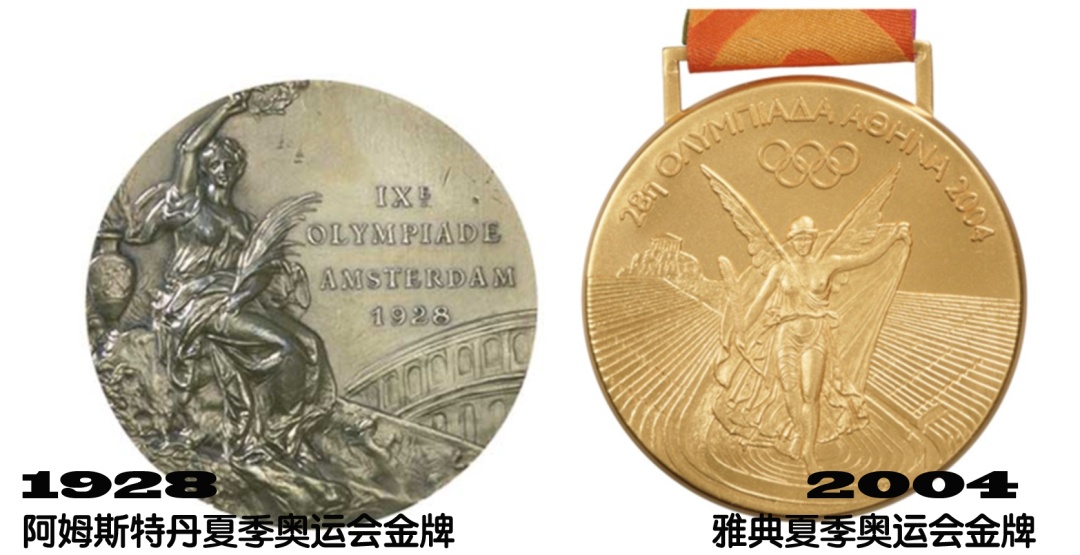 奥运会奖牌设计从1928年开始标准化,胜利女神一手执月桂花冠,一手执棕榈叶。2004年开始图案有了变化,但仍然是胜利女神尼克。