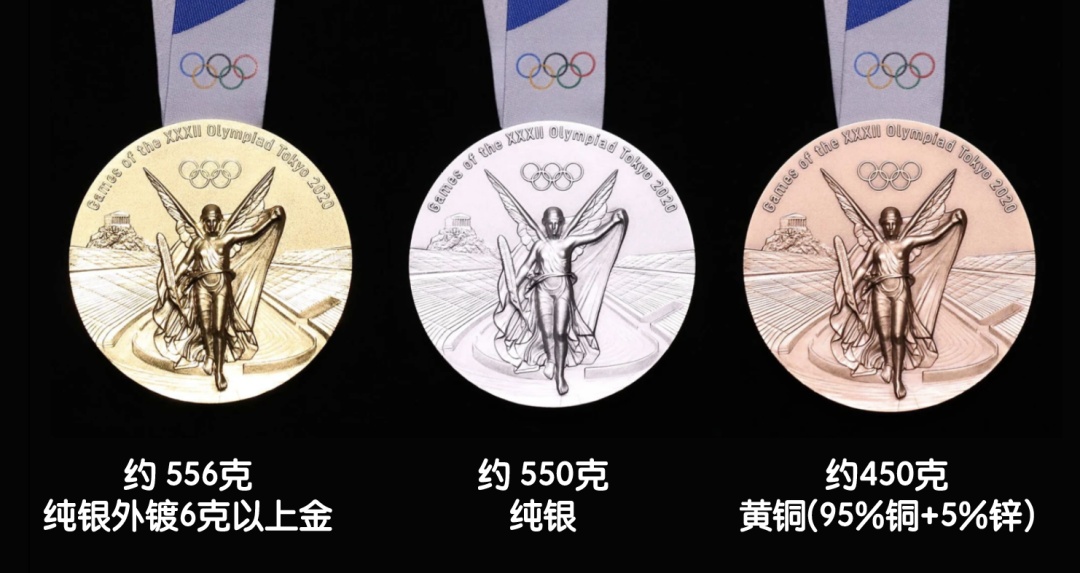 此次2020年东京奥运会奖牌直径为85毫米,最薄部分7.7毫米,最厚部分12.1毫米。每块金牌包含550克银和6克金,银上镀金。