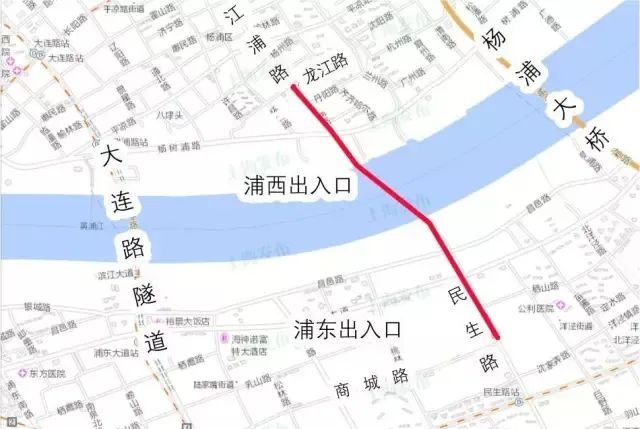 江浦路越江隧道新建工程北起杨浦区江浦路、龙江路路口,向南下穿福宁路、杨树浦路、黄浦江、滨江路、昌邑路、浦东大道、栖山路后出地面,至浦东新区民生路、商城路路口止。全长2.28千米,建设规模为双向4车道。