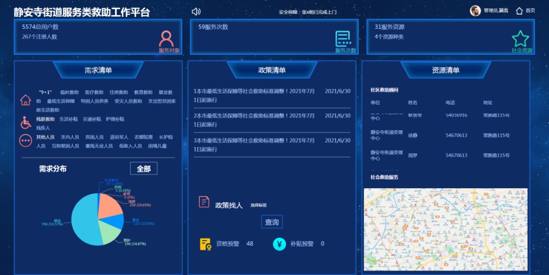 为响应《上海市民政局印发<关于本市开展社会救助领域 政策找人”试点工作>的通知》要求,贯彻落实“人民城市人民建,人民城市为人民”重要理念,以困难群众“应保尽保、应救尽救”为目标,静安寺街道全力打造“同心邻距离,服务无盲区——数字化救助平台”(以下简称“平台”),通过数据精准计算分析,主动发现困难群众,及时匹配政策,链接资源,重点关注“不声不响”的群体,寻找“沉默的少数”。
