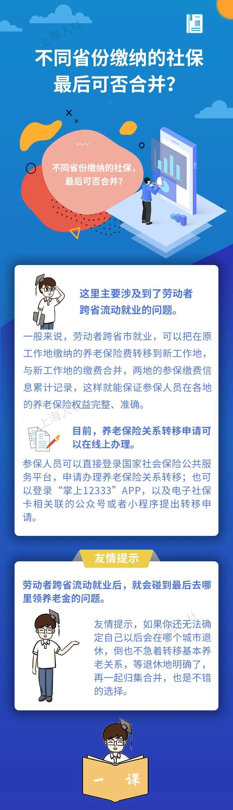 每天上一课 轻松学政策 网友“有时候”留言询问,不同省份缴纳的社保,最后可以合并吗?这个问题涉及到养老保险的转移接续,请仁仁博士来问大家解答:制图:振浩、正瑜编辑:佳乐 上观号作者:上海人力资源和社会保障