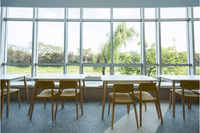 步入室内,更显明亮大气。除了满足师生基本餐饮需求外,夏雨厅也在一楼和二楼原理售餐台的区域设置了休闲区,为师生的学习和讨论提供了空间。一楼窗边还设有河畔坐席,师生可一边进餐一边欣赏樱桃河美景。