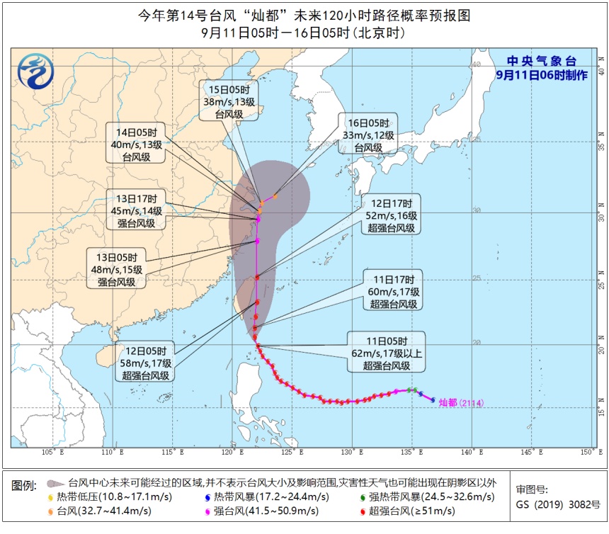 中央气象台最新预报,今年第14号台风“灿都”(超强台风级)的中心今天(9月11日)6时位于距离我国台湾省宜兰县偏南方向约520公里,就是北纬20.0度、东经122.0度,中心附近最大风力17级以上,62米/秒(约223公里/小时),中心最低气压915百帕。