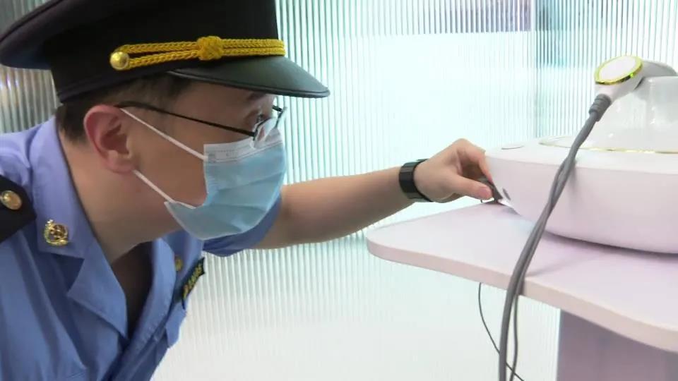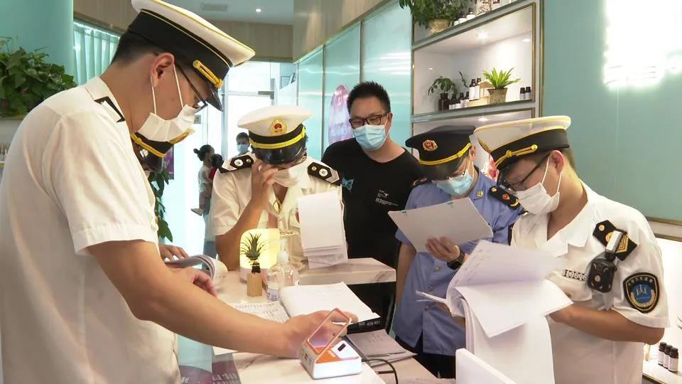 在城内崇明万达广场,执法人员对生活美容场所开展检查,重点检查生活美容场所是否取得公共场所卫生许可证等相应资质,美容仪器是否合法合规,是否开展割双眼皮、注射美容针、玻尿酸、祛痘、激光祛斑、脱毛、射频、超声等光电治疗及胶原蛋白、自体脂肪填充治疗等非法医疗美容行为。