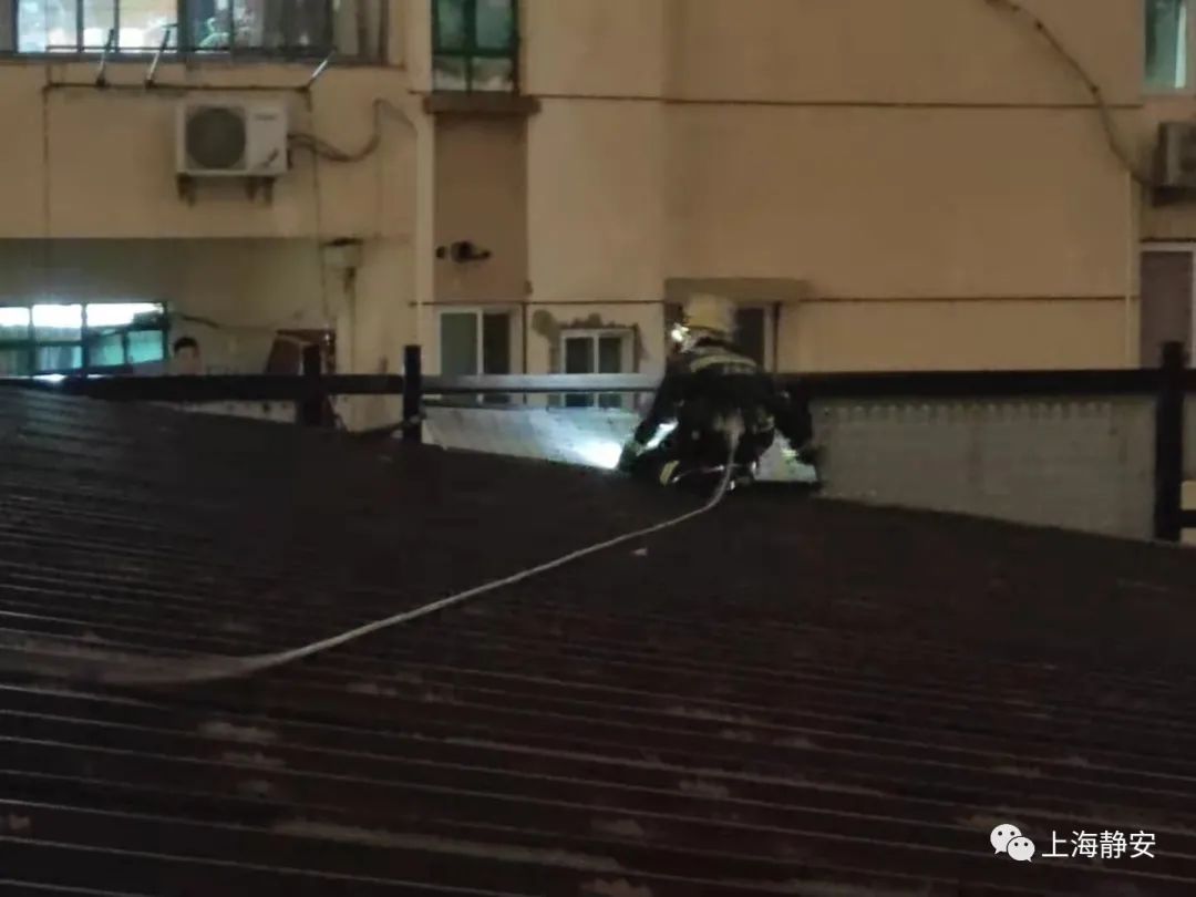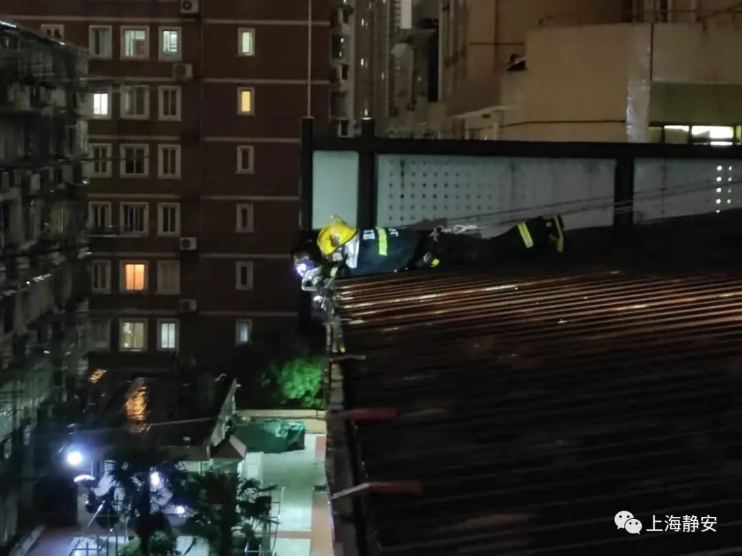 昨晚,在静安区芷江西路上一居民楼顶,消防员冒着风雨,系上安全绳、整个人趴在楼顶上,展开了紧张的高空排险。