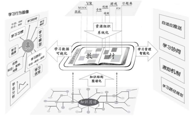 一是每一本教材都嵌入智能型数字教材系统。纸质教材与智能终端结合,集成与教材内容相匹配的数字化资源、教与学工具、学习社群、学习管理、教学策略实现,实现知识结构图谱化、资源组织系统化、学习数据可视化、学习管理智能化。
