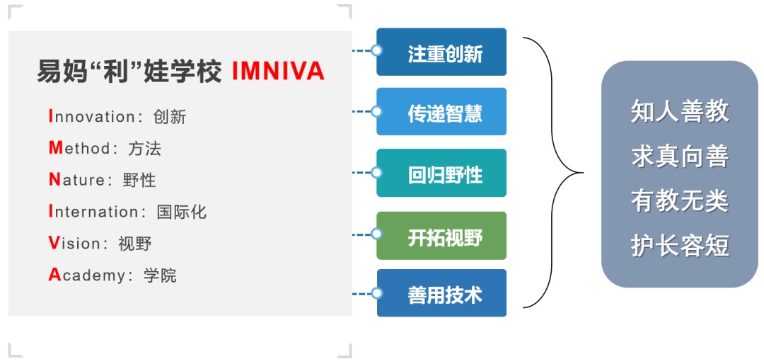 宝山未来学校的核心理念缩写为imniva,形象的称呼为:易妈“利”娃。