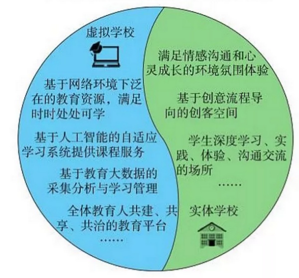 虚拟学校由全区共建、共享、共治。整合全区优质教育资源,教育专家、教研员、名师联合组成全学科教研共同体,融合大数据、物联网、人工智能等技术,打造面向全区的新型优质教育资源供给模式。采用融合式教学,虚拟学校的课程服务,不受时空限制,对外开放,本校学生完整参与课程服务,共同体学校学生也可以申请接入,获得学分。