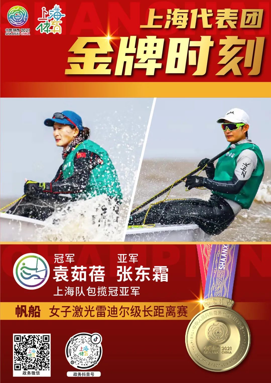 9月23日,第十四届全运会帆船项目女子激光雷迪尔级长距离赛迎来金牌日,上海队袁茹蓓、张东霜成功包揽该项目的金、银牌。