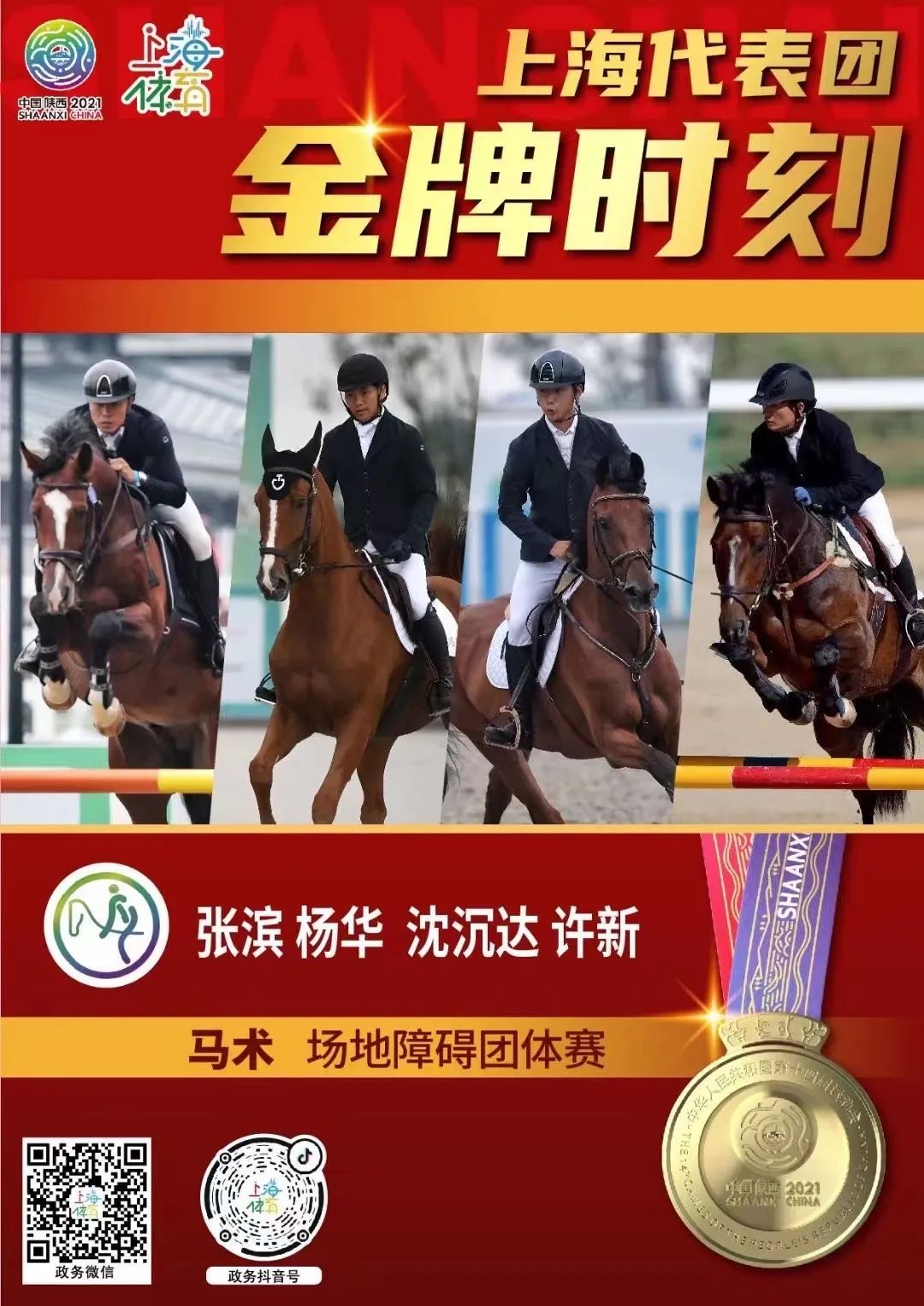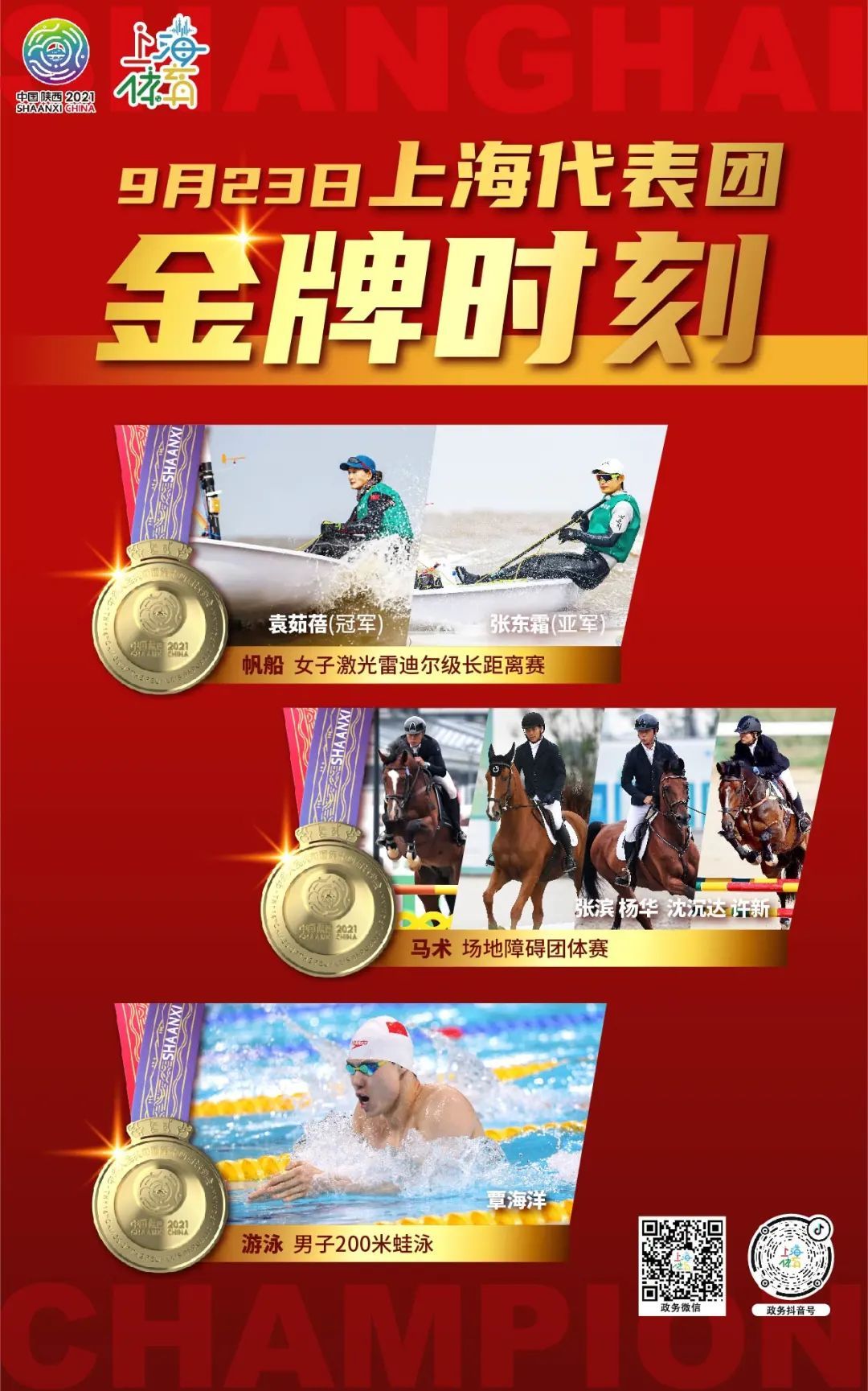9月23日,第十四届全运会继续举行。在马术项目场地障碍团体赛中,上海队全运八朝元老张滨率杨华、沈沉达、许新时隔十六年再次夺得该项目的金牌。同时,帆船、游泳赛场也传来捷报,上海单日共获得竞赛项目3金1银,群众组赛事围棋项目1金。申城老将们用英勇拼搏的身姿书写着上海体育精神的薪火相传。
