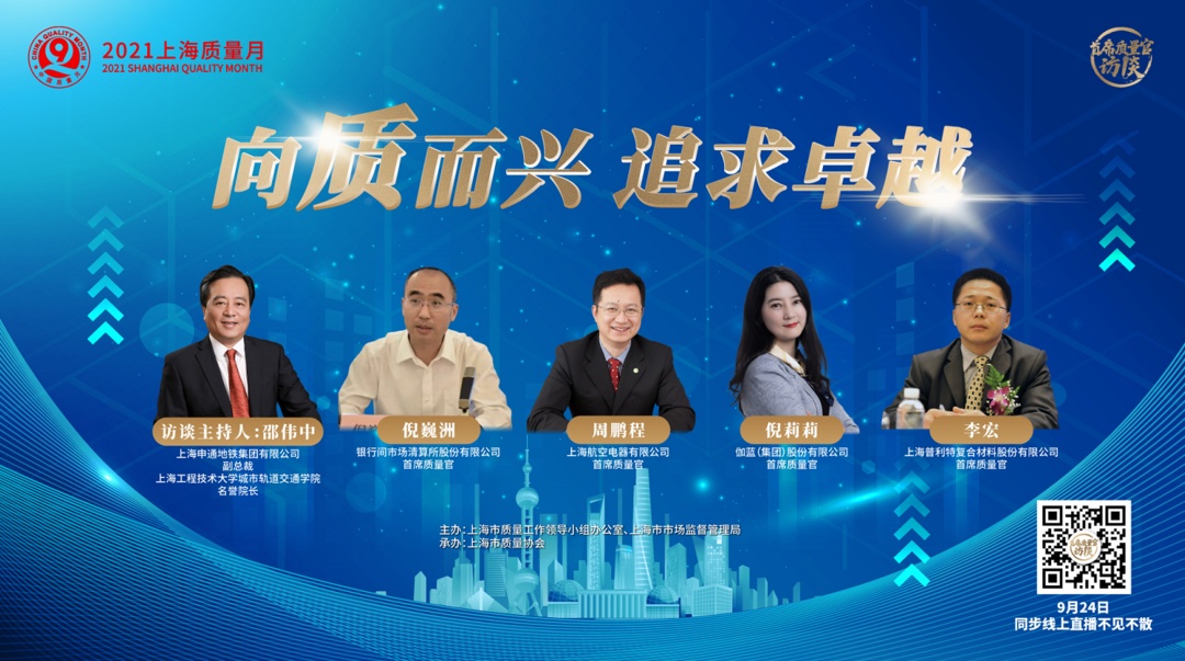 9月24日下午,市质量工作领导小组办公室、市市场监管局举办以“向质而兴 追求卓越”为主题的企业首席质量官访谈活动,宣传推广本市企业实施首席质量官制度、加强全面质量管理,激发本市更多企业首席质量官为上海建设具有国际竞争力的质量高地作出贡献。
