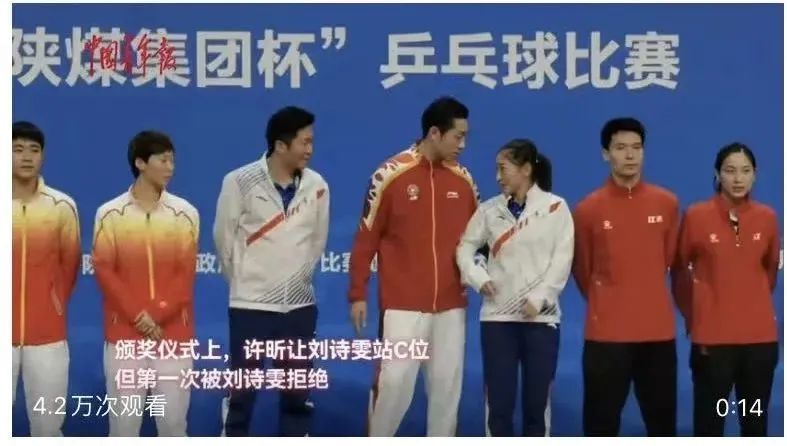 站上领奖台时,许昕两次坚持让刘诗雯站c位