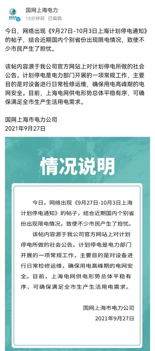 今日,网络出现《9月27日-10月3日上海计划停电通知》的帖子,结合近期国内个别省份出现限电情况,致使不少上海市民产生了担忧。