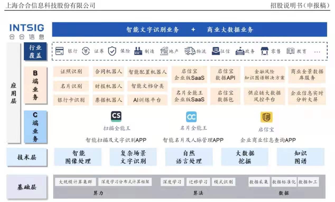t合合信息的b端业务是为企业客户提供以智能文字识别、商业大数据为核心的服务,现已形成了包括基础技术服务、标准化服务和场景化解决方案的业务矩阵,满足客户降本增效、风险管理、智能营销等多种需求,助力客户实现数字化与智能化的转型升级,目前已在银行、保险、证券、汽车、政府、物流、制造、地产、零售等近30个行业实现成熟应用,三星、联想、亚马逊、招商银行、建设银行、中国银行、中国人寿保险、中国太平洋保险等超过80家世界500强企业都是合合信息的客户。在c端业务方面,合合信息旗下的扫描全能王、名片全能王、启信宝3款产品,覆盖全球百余个国家和地区的亿级用户。2021年3月,3款app月活合计约1.2亿。