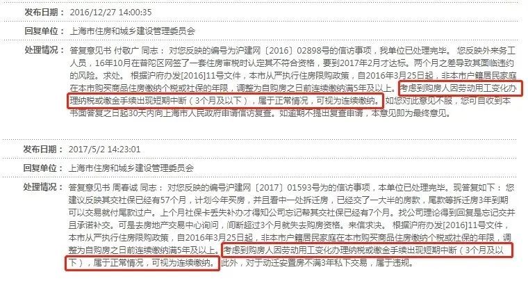 据媒体公开报道和市政府对信访的回复,上海市住房和城乡建设管理委员会曾明确表示,考虑到购房人因劳动用工变化办理纳税或缴金手续出现短期中断(3个月及以下),属于正常情况,可视为连续缴纳。