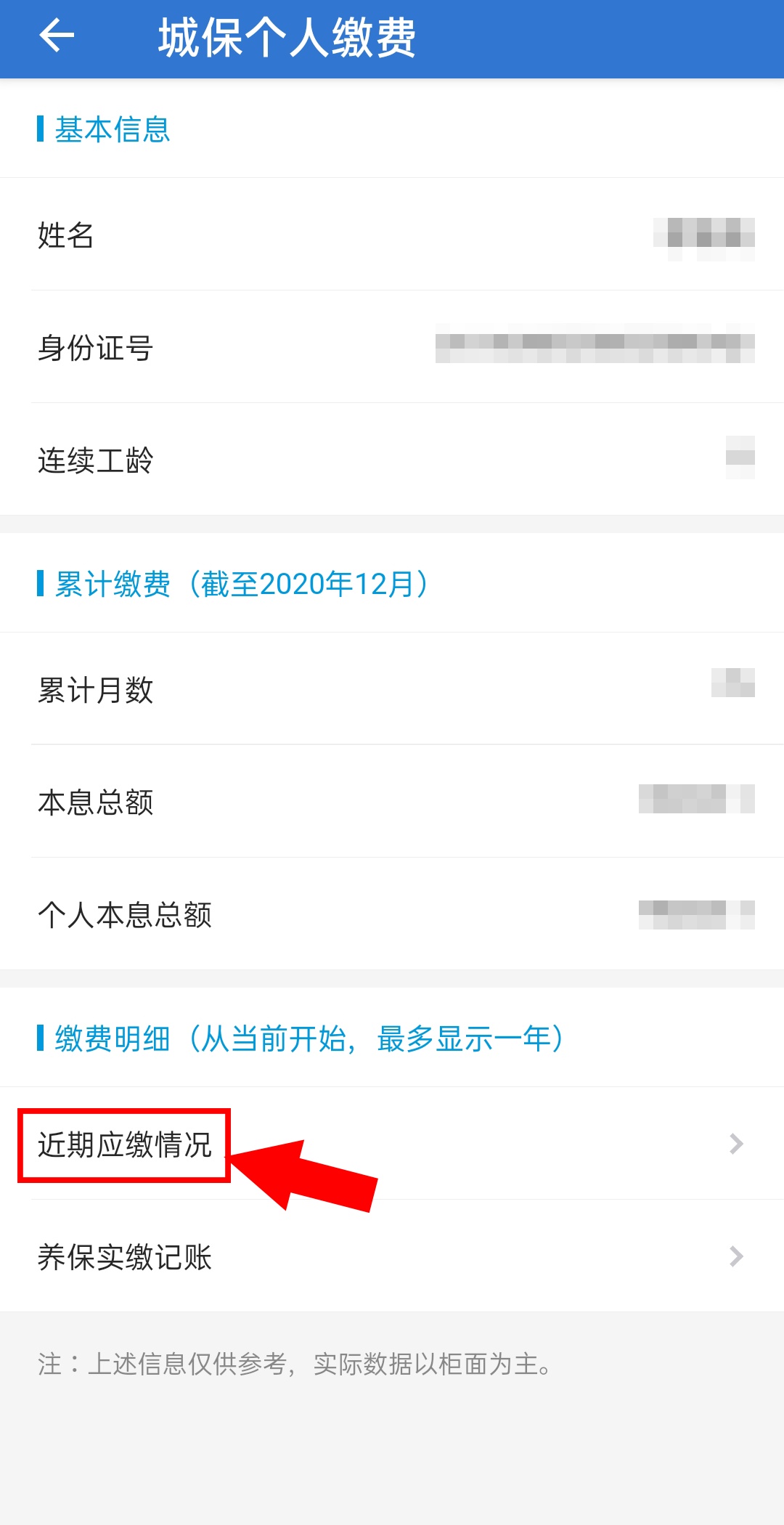 答:可登录“上海人社”app查询。登录后在首页找到“城保个人缴费”,选择“近期应缴情况”就可以查询到近一年的缴费基数和基本养老保险、医疗保险、失业保险的个人缴费额。