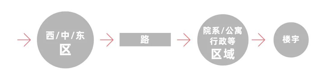 校园导视标识系统的设计不能脱离场地的区块功能,因此本项目采用了“先找大区域、再找路、再寻找各二级区域,最终寻找到各自目的地”的总体寻路逻辑方法。