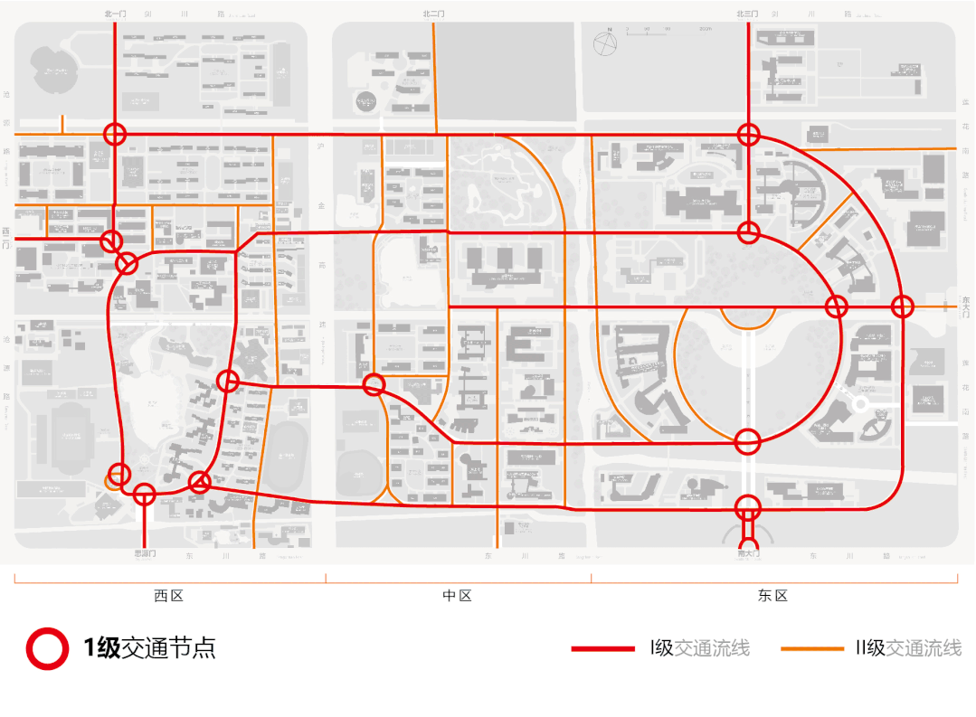 从平面整体规划切入,对校园的交通及功能区进行了系统分析,提出了“三分校园”的概念,即将校园分为“西、中、东”区,方便分区域检索校内各目的地,提升寻路的系统逻辑性,减少各区内的寻路信息量。