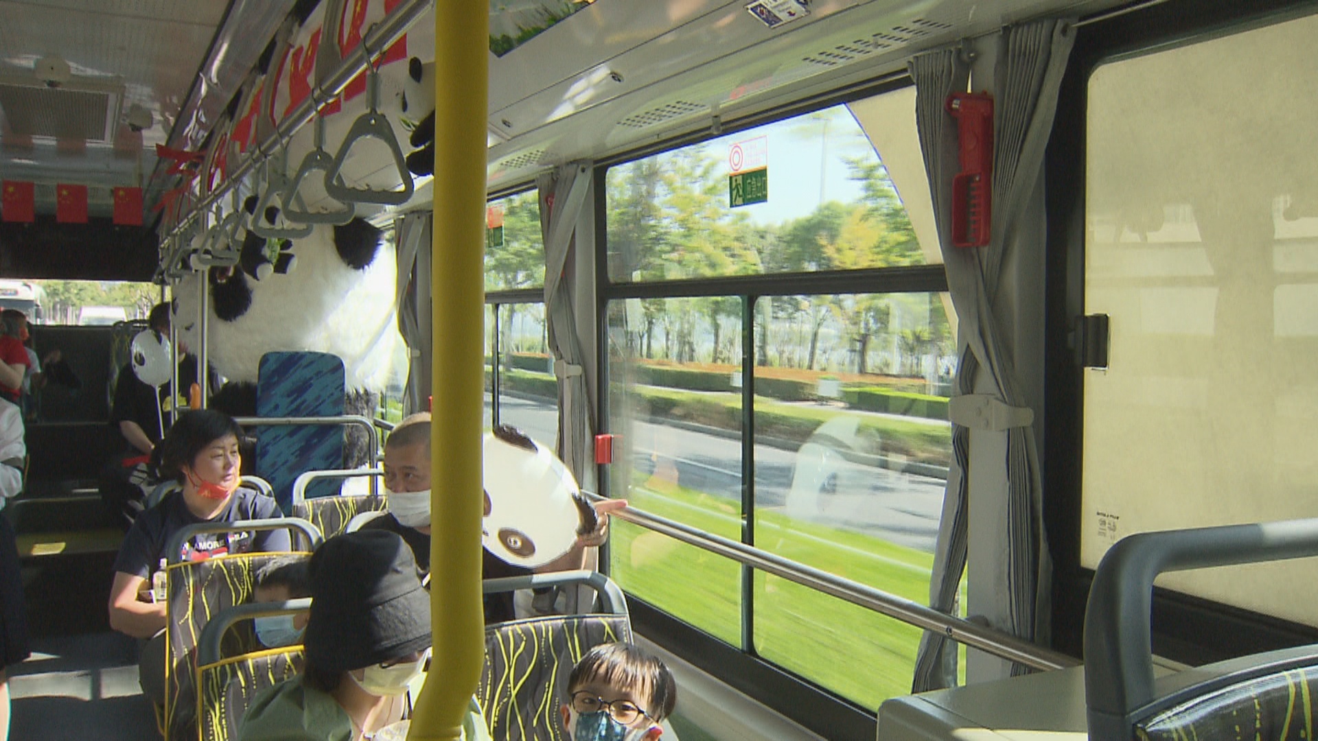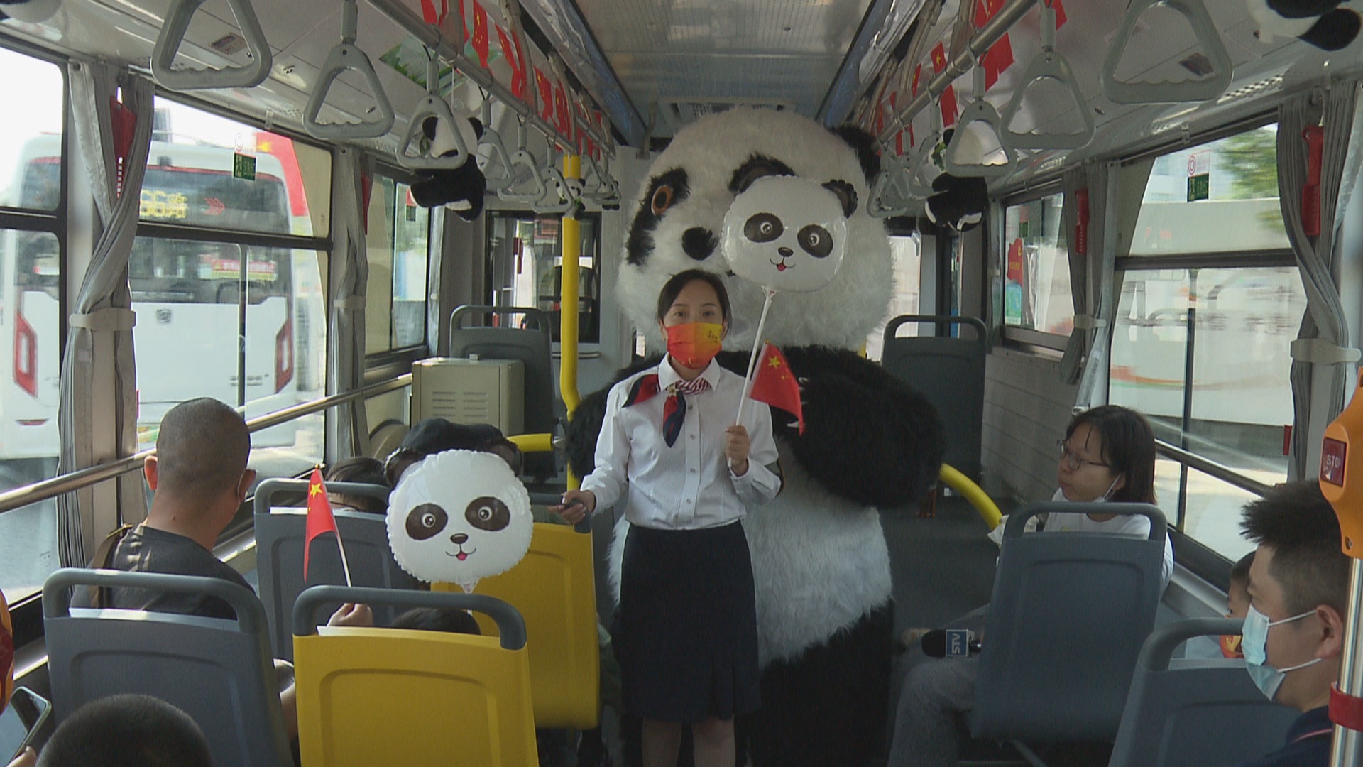 除了一路上有讲解外,还有一只巨大的熊猫全程在公交车上与乘客互动。车厢内部各个角落也悬挂了红旗、熊猫挂件等,营造出浓厚的节日氛围。而在终点站,小乘客们可以与萌萌的大熊猫以及熊猫造型的公交车来张有趣的合影,还会收到大熊猫造型的卡通气球。这个活动将一直持续至长假结束,家长不妨带着孩子一起,来滨江一路看风景,与熊猫偶遇一下吧。