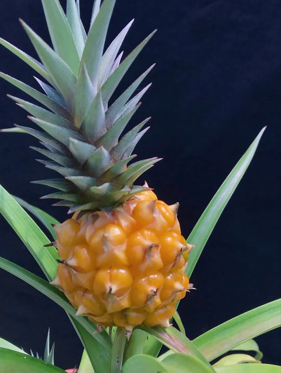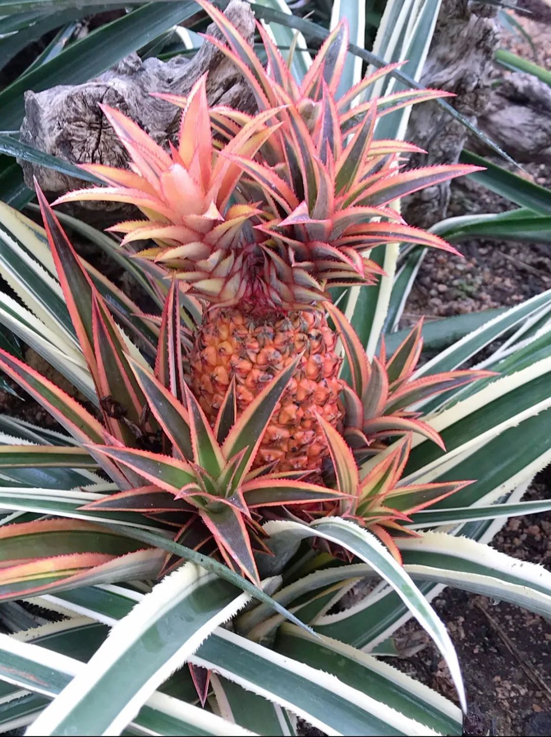 既有以观赏为主的迷你型菠萝,如红叶红果的“帕齐”菠萝、绿叶绿果但成熟时果实亮晶晶、黄橙橙的“科罗娜”菠萝,还有果品市场上较流行的食用菠萝。此外还种有既好看又好吃的“三色”菠萝,其叶缘镶有白边,且整株披有红晕,连果实也带花边、披红晕,明明可以美貌悦人,却偏偏还美味在线!