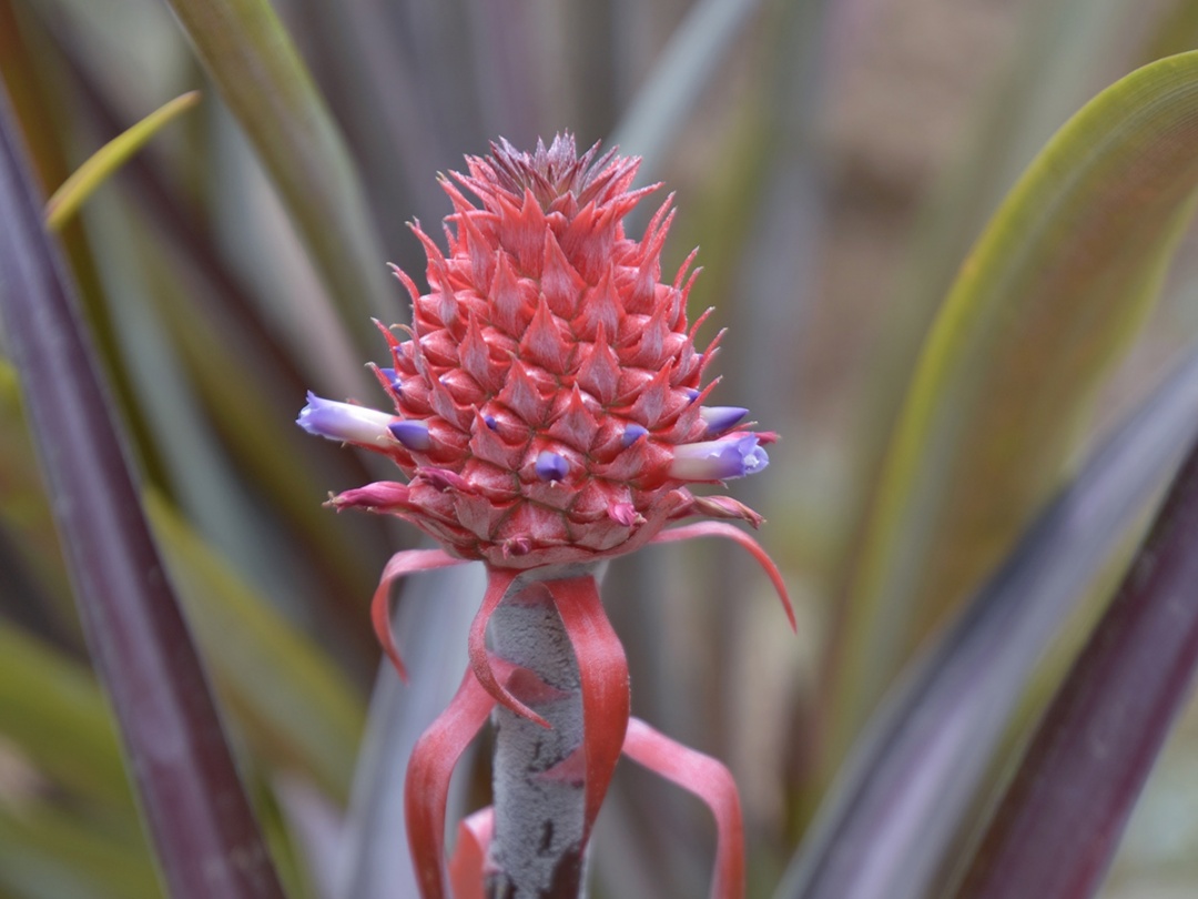由于菠萝园内的菠萝都没有进行人工催花,而是待植株成熟后自然开花,因此花、果期自然错开。菠萝从开花到果实成熟通常要经历约4个月时间,因此经常在热带花果馆中上演“你方唱罢我登场”的现象,这里一年四季都能看到不同的品种正在开花或结果的状态,给游客们带来“小惊喜”。