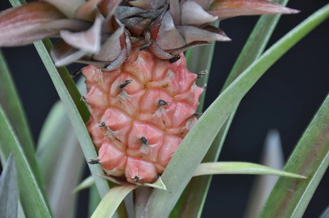 除了观赏和食用的菠萝,菠萝园内还有一个品种也很特别,那就是叶细长、叶色呈暗红色的“苦巧克力”菠萝,其果实较小。临近成熟时,果皮呈美丽的粉红色,该品种是专门用来生产菠萝纤维。