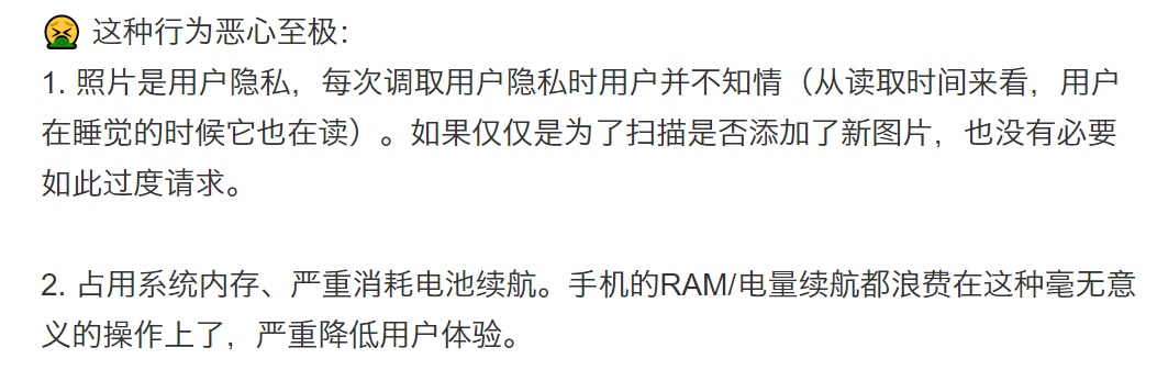 从时间来看,用户在睡觉的时候微信也在读取属于用户隐私的照片,另外这种行为占用系统内存、消耗电池续航,严重降低用户体验。