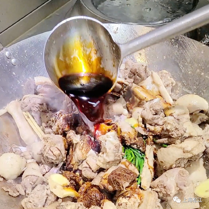 4. 接下来加黄酒增香,加老抽上色,加生抽增鲜,煸出酱香味;