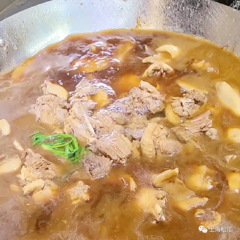 8. 汤水收浓,出锅时撒一把大蒜叶增香。