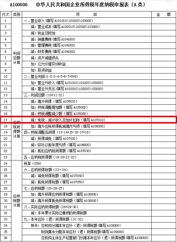 3.《中华人民共和国企业所得税年度纳税申报表(a类,2017年版)》(a100000)第17行“免税、减计收入及加计扣除”将根据《免税、减计收入及加计扣除优惠明细表》(a107010)填报的数据自动填入属于税收规定免税收入、减计收入、加计扣除金额。