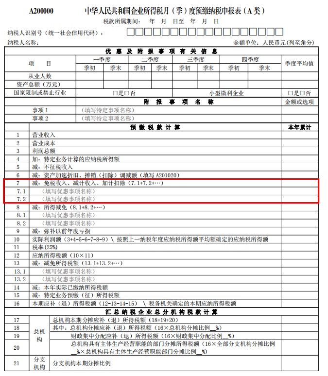 在《中华人民共和国企业所得税月(季)度预缴纳税申报表(a类)》(a200000)中第7行“免税收入、减计收入、加计扣除”根据相关行次计算结果填报。根据《企业所得税申报事项目录》,在第7.1行、第7.2行……填报税收规定的免税收入、减计收入、加计扣除等优惠事项的具体名称和本年累计金额。
