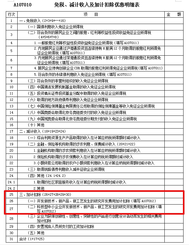 2.《免税、减计收入及加计扣除优惠明细表》(a107010)第26、27行“三、加计扣除”类将根据《研发费用加计扣除优惠明细表》(a107012)自动带出纳税人享受的相对应加计扣除项目名称、减免税代码及加计扣除的金额。