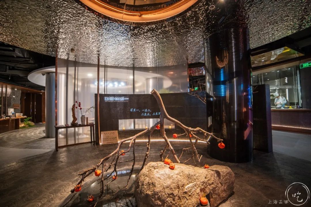 从进门处的中庭圆楼梯,到穹顶镜面水波纹倒映出地面水池的玄武石身姿;从禅意洒然的“和合天台”、仙意缭绕的“神仙雅居”,到天工秀丽的“石塘半岛”、桃源拙朴的“东海明珠”,四大风情各异的包厢萃取复刻台州旖旎山水,食客足不出沪,亦如身临其境。