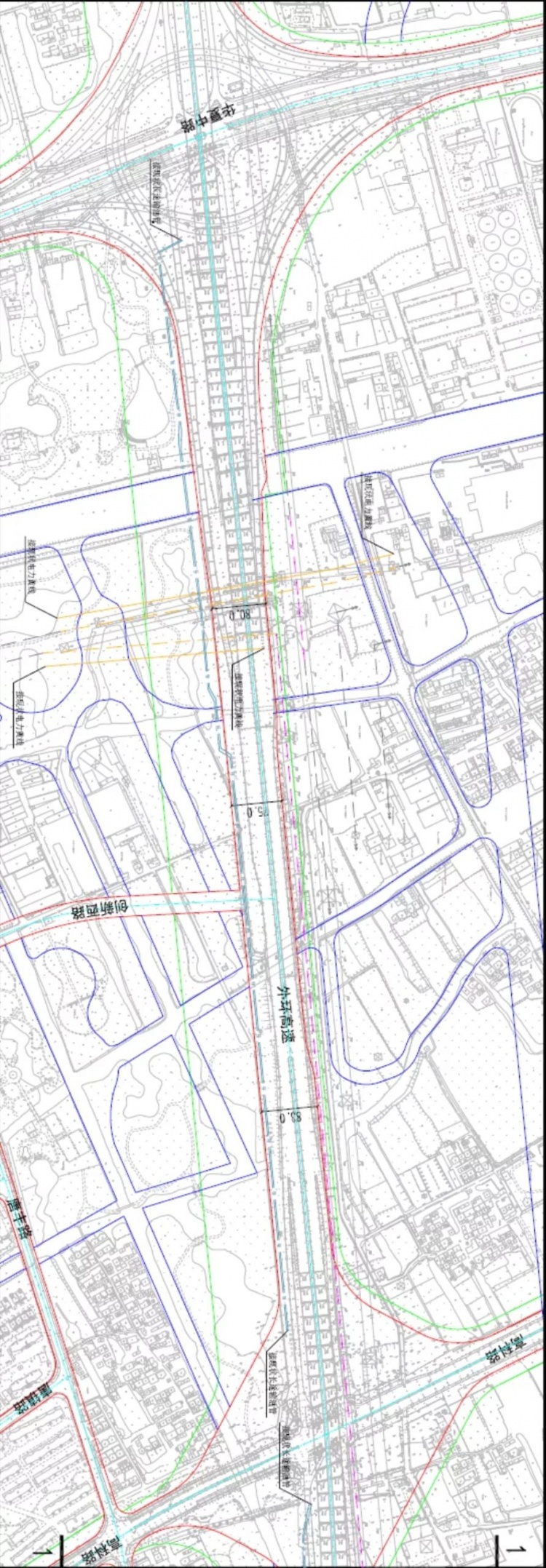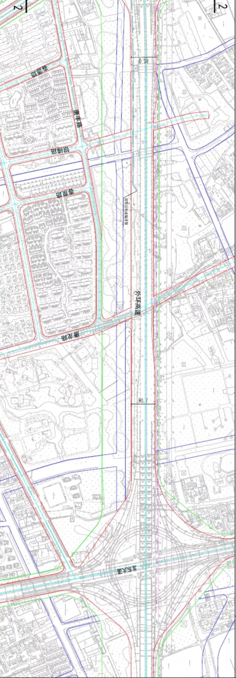 高架主线:高架道路按快速路标准规划建设,机动车专用,双向8车道。