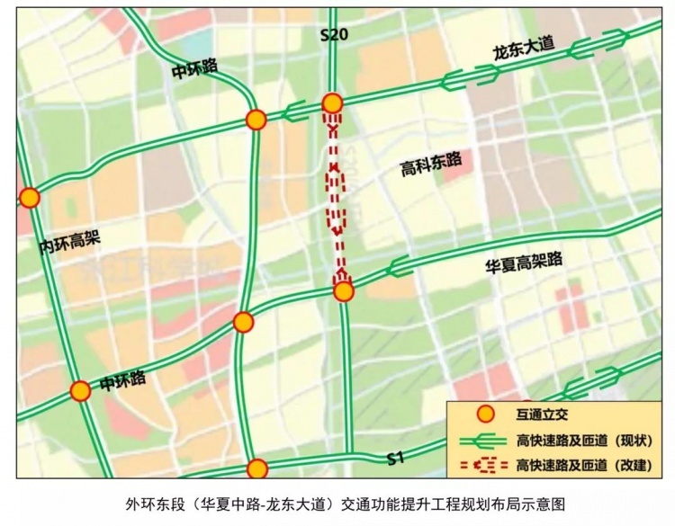 外环主线:将外环东段(华夏中路-龙东大道)进行抬升,形成高架主线道路。