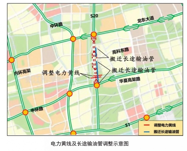 输油管调整方案为:为满足相关国家法规的要求,对外环东侧规划道路红线内dn610、dn273长途输油管进行局部搬迁。